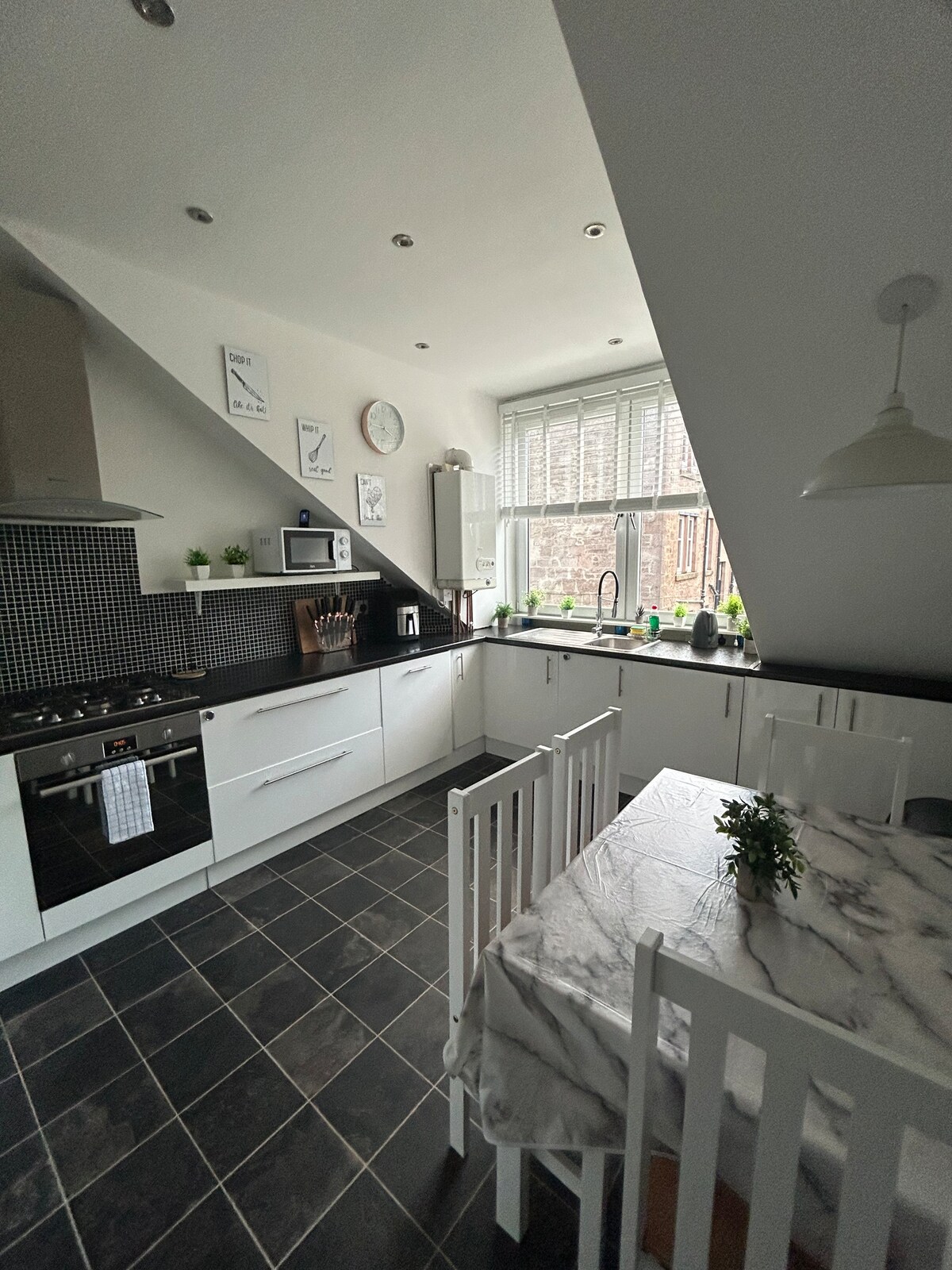 Nedavno renoviran stan, sa svim novim nameštajem. Dve spavaće sobe - jedan bračni krevet i jedan bračni krevet, sa putnim krevetićem ako je potrebno, kao i vazdušni krevet. Gosti će imati jednostavan pristup svemu iz ovog smeštaja koji se nalazi u centru. Odmah pored Greenock Vest Enda, udaljen je samo 5 minuta hoda do centra grada i 10 minuta hoda do šetnice sa širokim spektrom barova i restorana. Iza ugla je željeznička stanica Greenock West, a odatle je 30 minuta vožnje do centra Glazgova.