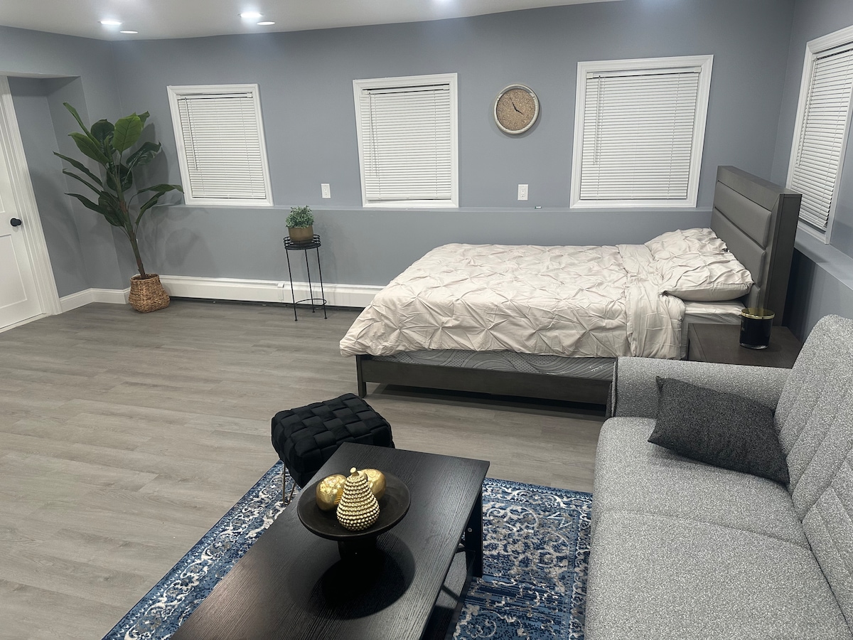 Its coziness will make you feel at home the second you step in. This cute ground floor 280 sq ft Tiny Guest Suite is Fully furnished and nicely decorated - it comes with anything you can possibly imagine. It consist of 1 bedroom 1 bathroom & a kitchen/dining/living room area Rooms' sizes: Bedroom: 10ft x 7 1/2ft LR kitchen DR area: 19ft x 10ft Bath: 40" x 80" Given how close it is from everything - It is perfect for guests who plan on commuting to the city by train or move around by Uber.