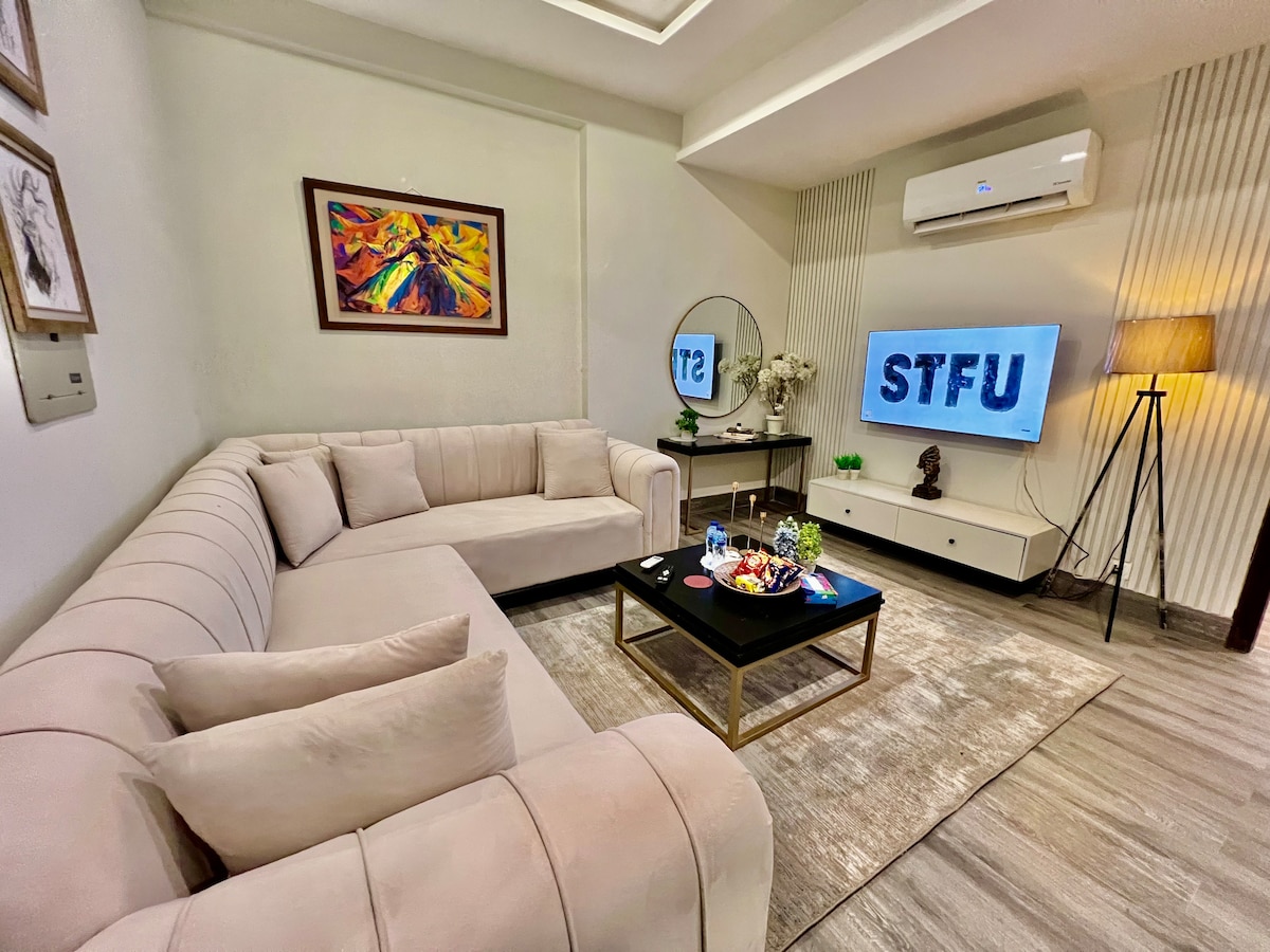 Dobro došli u The Beige H, miran jednosoban stan u Bahria Heights 1, D Block. Dizajniran za opuštanje uz dašak luksuza, ovaj udoban smještaj nudi mirnu atmosferu za vaš boravak. Savršen za goste koji cijene udobnost i stil, The Beige H ima 1 spavaću sobu sa bračnim krevetom, 2 kupatila, prostrani salon sa Netflix-om, Wi-Fi i sve druge sadržaje. U blizini se nalazi teretana svjetske klase, unutrašnji hladni/grijani bazen, sauna i sauna.