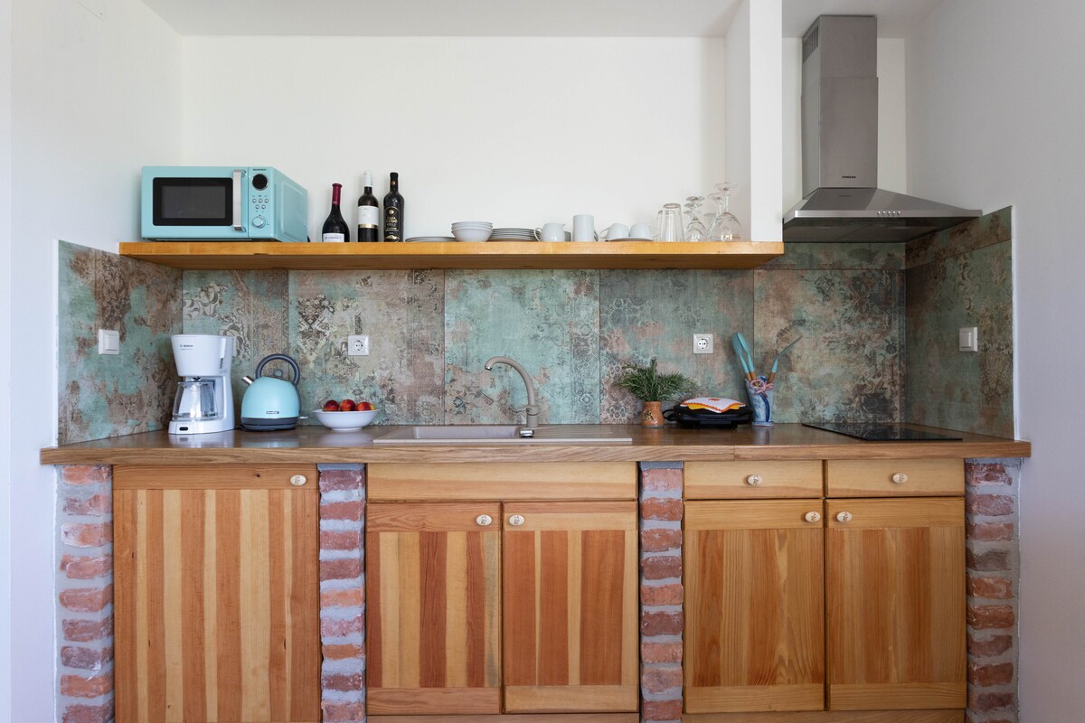 Stan ima dva sprata, površine 54 m2. Na glavnom spratu se nalazi dnevni boravak sa kuhinjom u istom velikom prostoru, kupatilo i šarmantan balkon . Uz stepenice ćete naći romantičnu spavaću sobu sa malim prostorom za sedenje. Mi smo kućni ljubimci i prihvatamo jednog kućnog ljubimca besplatno, ali ćemo naplatiti naknadu od 5€ po danu za svakog dodatnog kućnog ljubimca preko prvog.