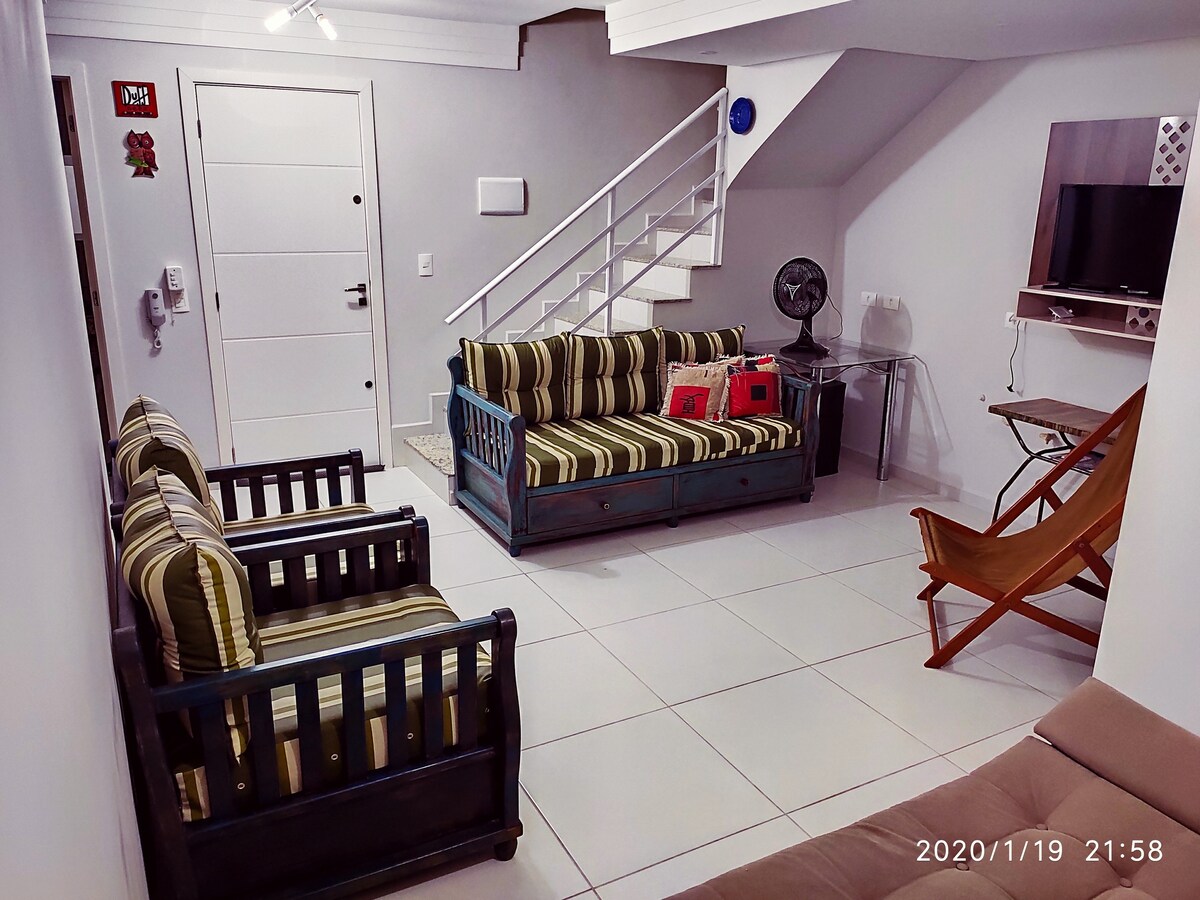 Privatna prizemna kuća za do 6 osoba, sa nadrealnim spoljnim prostorom, okrenuta je prema plaži Barra do Saí. Ponesite samo ono što treba da jedete, pijete i oblačite se dok je kuća kompletna. Wi-Fi, klima-uređaj, posteljina, peškiri, šampon, regenerator, kompletan materijal za plažu, 2 smartv-a sa IPTV-om, roštilj i 2 bicikla za šetnju u slobodno vrijeme. Spoljašnji prostor sa rustikalnim stolom, pergolatom, natkrivenim đakuzijem sa hidromasažnom kadom i hromoterapijom i nevjerovatnim privatnim bioskopom. Primaju kućne ljubimce