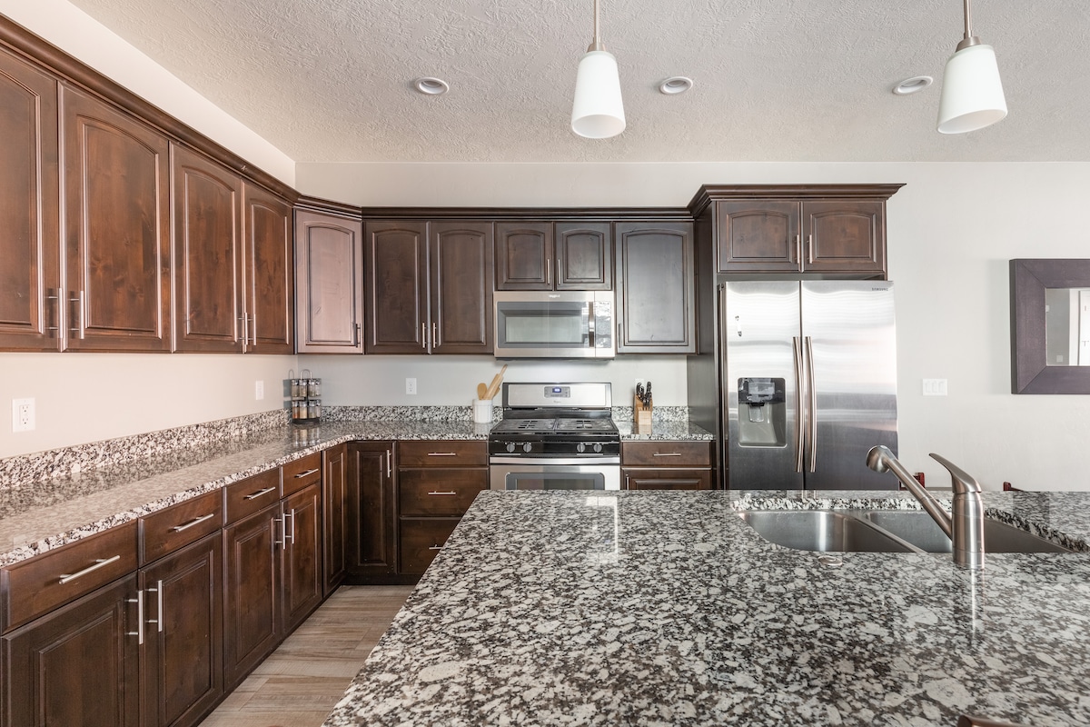 Luksuzni dvospratni dom sa 3 spavaće sobe i 2,5 kupatila. Savremena kompletno opremljena kuhinja. Dvije porodične sobe, kamin, garaža za 2 automobila sa priključkom za punjenje električnih vozila od 50 ampera. Vanjsko dvorište za roštiljanje, objedovanje pod svjetlima kafića ili pečenje s'mores preko vatrogasnog stola. Pješačenje, vožnja biciklom, konjima, ATV stazama i amfiteatar Tuacahn udaljeni su svega nekoliko minuta, a Sand Hollow Aquatics Center je prekoputa! Tereni za bazen i kiseli krastavac su dostupni svim gostima. Dođite i uživajte danas!