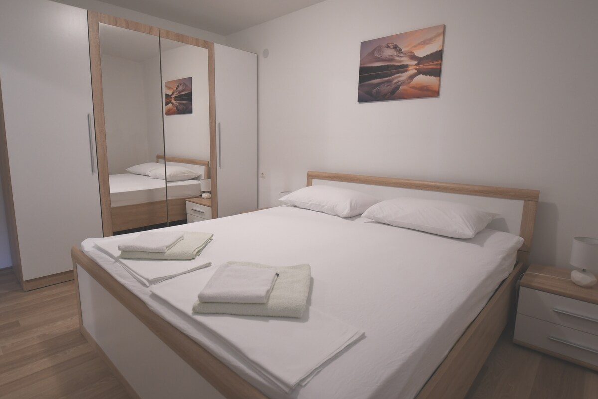 Novouređeni stan na plaži u Tisnom, udaljen samo 2 minuta hoda do plaže i 5 minuta do restorana i Garden Festivala. Sadrži 2 bračna kreveta, 2 kupatila, potpuno opremljenu kuhinju, salon, trpezariju i osunčani balkon sa pogledom na more. Uključuje Wi-Fi, klima-uređaj, TV i bezbjedan parking s ogradom. Prikladno za kućne ljubimce i savršeno za opuštanje ili istraživanje obale. Imate li pitanja o Tisnom ili boravku? Slobodno nam se obratite - rado ćemo vam pomoći!