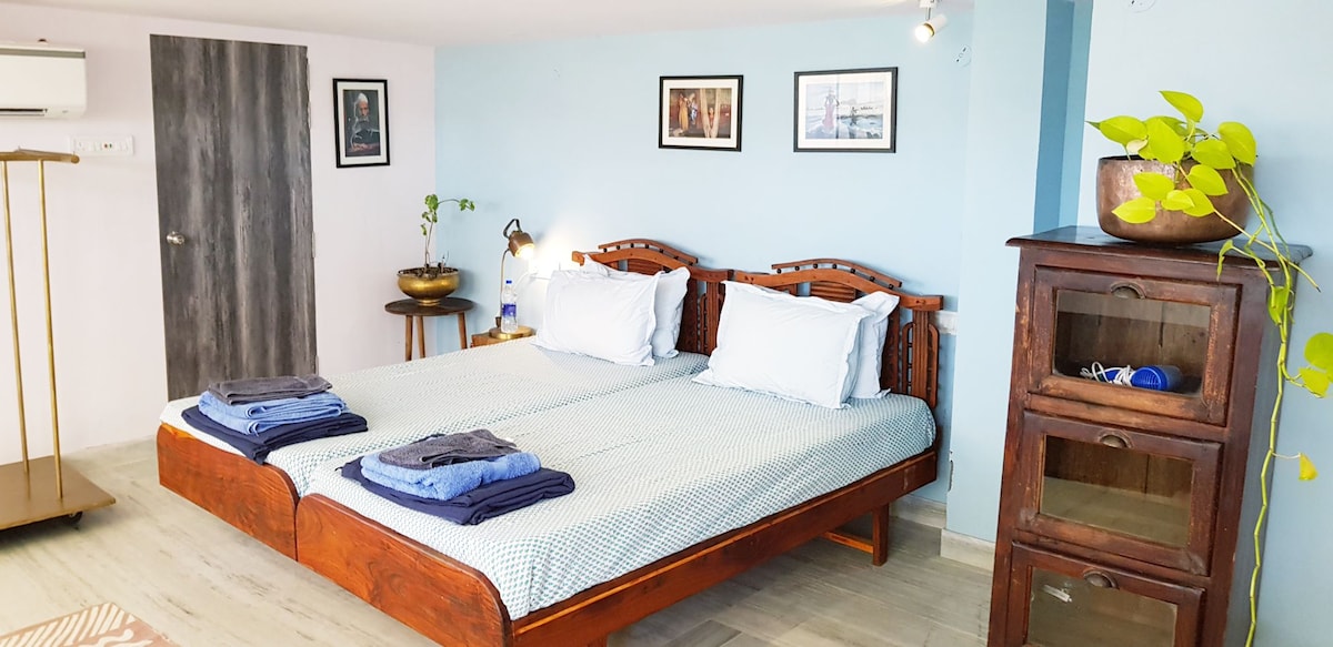 It's a Separate Two room's kitchen(Studio ) portation which will have its independent entrance, you can enter in a Hygiene Family room without having to touch anything with comforts like home, breakfast buffets and bellhop service Details: Bed Room:One one queen size bed with 6” soft mattress Living Room: One Heritage Bed 4X6 size with mattress Heritage writing desk with chair Facilities: Kitchen with Waterproofing machine, Fridge Attached toilet with electric hot water geyser Free