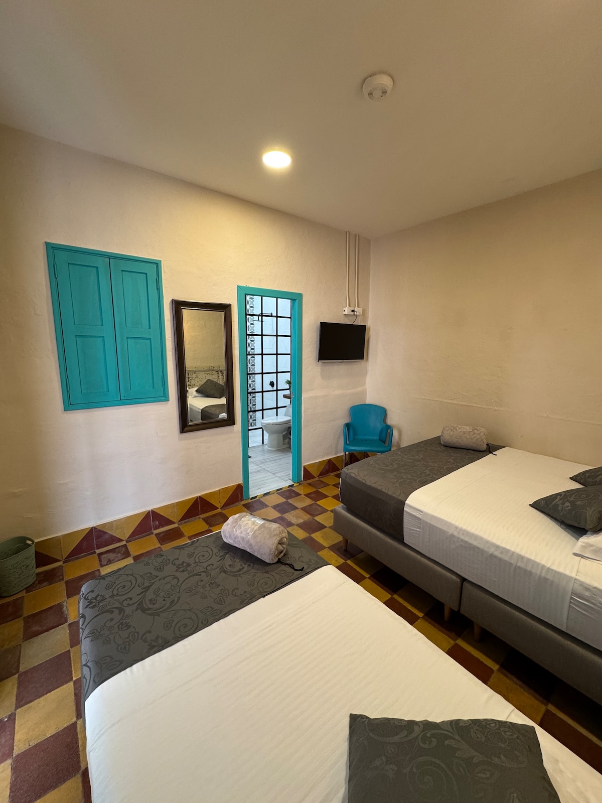Habitación tradicional, ideal para tres personas. Dispone de una cama doble y una individual, mesa de noche, ventilador, televisor, baño privado y espejo, ofreciendo un ambiente cómodo y funcional para una estadía placentera.