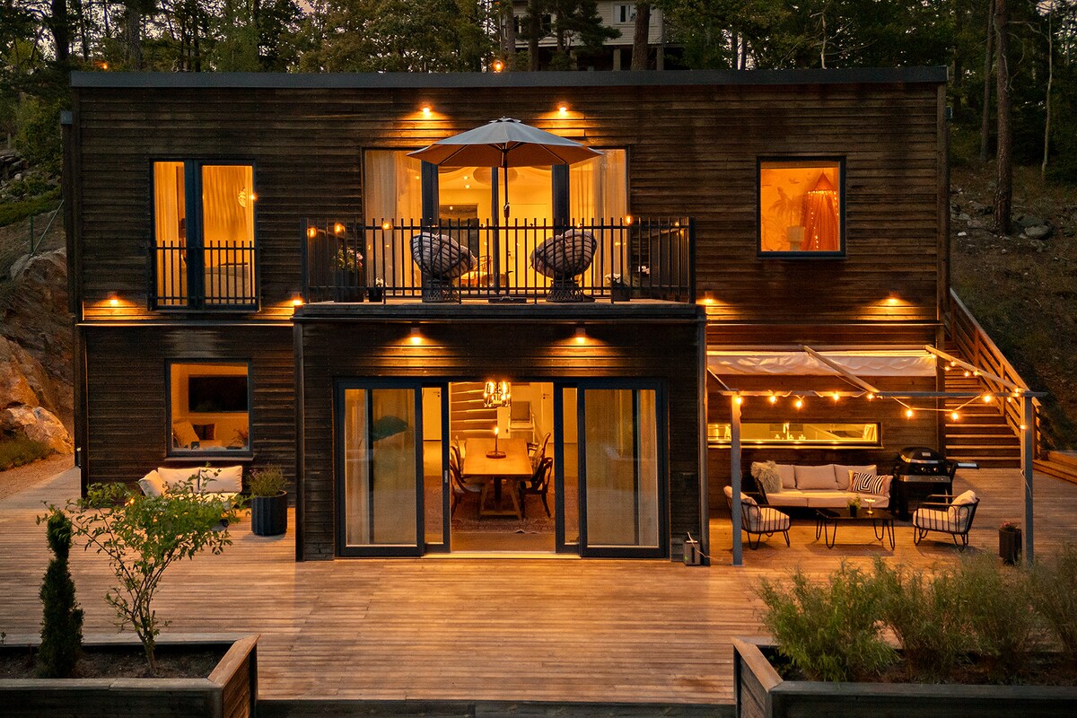 Uživajte u kući na vodi od 50 m2 sa sopstvenom saunom i panoramskim pogledom na vodu. Plivajte direktno iz spavaće sobe. Imaćete nezaboravan doživljaj zbog pogleda, prelijepe lokacije, bašte i mola sa sunčalištem. Naš brod je pogodan za parove koji vole da iznenade ili proslave svog partnera, avanturiste koji žele da se približe prirodi i da još uvijek budu blizu Stokholma. Kanu je dostupan ljeti. U večernjim satima nudimo i dodatnu spa i saunu sa grijanjem na drva.