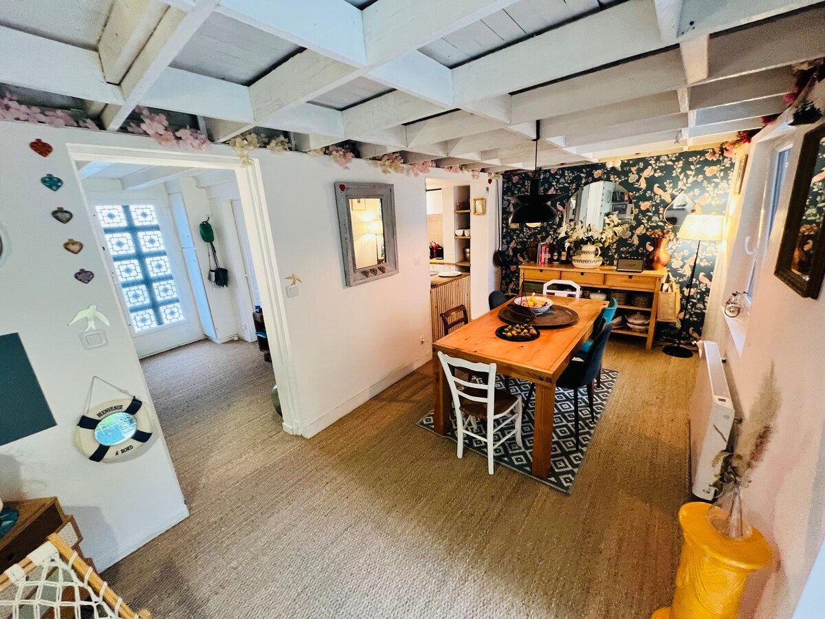 Nudimo vam ovaj renovirani stari mlin, usred Jarnaka, smješten na Charenteu, tih, prelaz i vrlo svijetao; pažljivo uređen sa jedinstvenim pogledom na vodu i zemljište dvorca, uključujući sa prelijepe terase i balkona. Kao i na brodu, kuća nudi sve korisne udobnosti, na pješačkoj udaljenosti od svih sadržaja i prodavnica u centru grada. Udaljeni ste 10 minuta hoda od željezničke stanice Idealno za opuštajući boravak ili profesionalnu misiju. Wi-Fi je dostupan za miran rad.