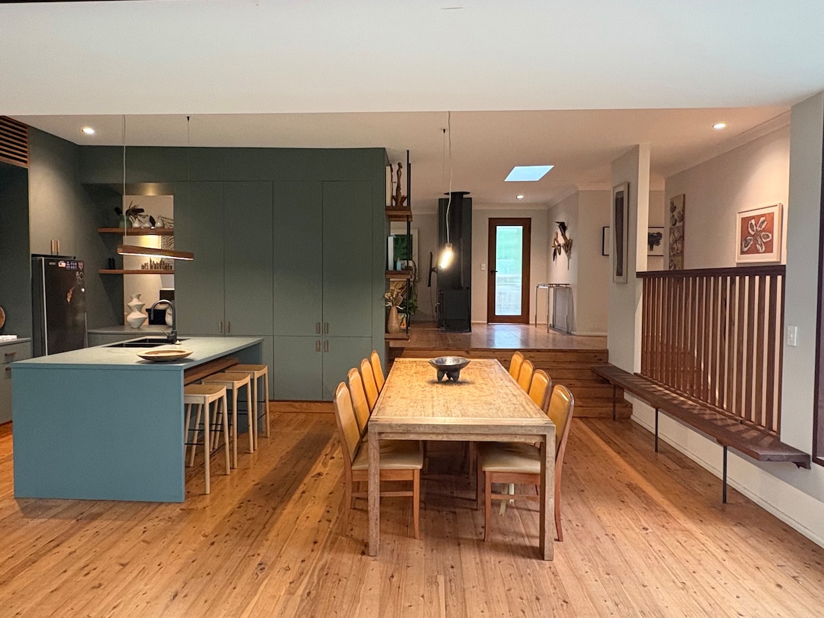 Osjetite trenutno opuštanje dok uživate u spektakularnom pogledu na obalu iz ovog elegantnog stambenog prostora, samo 90 minuta južno od Sidneja i 700 metara hoda do plaže Seven Mile. Otvorite dvokrilce kako biste osjetili okeanski povjetarac i proširite prostor do prostrane terase. Ili se udobno smjestite pored kamina u hladnijim mjesecima. Sa doručkom i prostorom za opuštanje na otvorenom, bićete razmaženi mestima za okupljanje. Vaš pootch može da divlja u travnatom, potpuno ograđenom dvorištu i uživa u boravku na plažama pogodnim za pse u regionu.