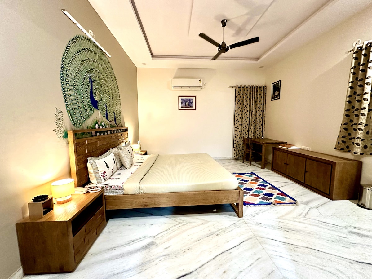 Mirna butik vila sa 5 spavaćih soba samo 2 km od aerodroma Džodpur. Savršeno za porodice i grupe, sa prostranim sobama, modernim sadržajima, udobnim dnevnim boravkom, potpuno opremljenom kuhinjom, internim kuvarom i prelijepim prostorom za sjedenje na otvorenom. Okružena prirodom i paunovima, Anand Villa nudi udobnost, mir i praktičnost za nezaboravan boravak u Džodpuru.