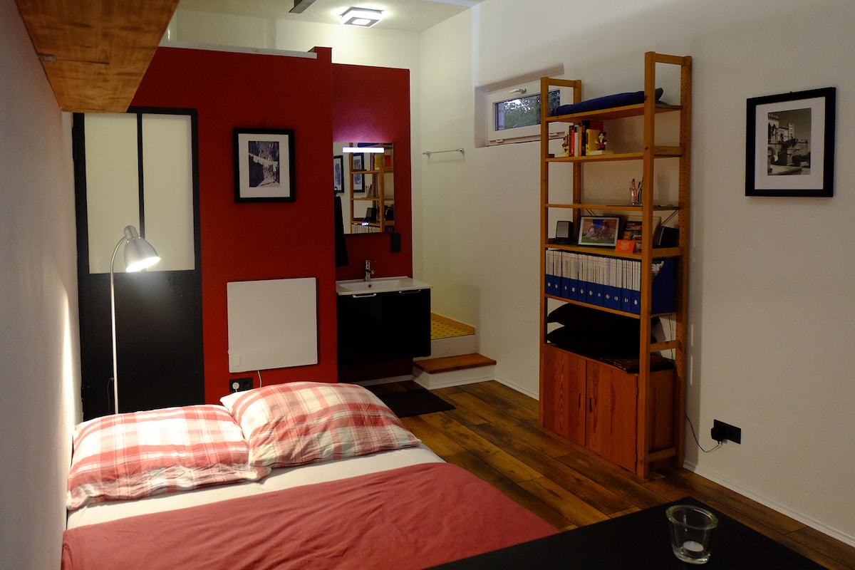 Odvojen dvorištem od glavne kuće, stan se sastoji od proširene štale od 3 nivoa. Na srednjem nivou su kupatilo i čajna kuhinja i krevet sa oprugama. Do galerije sa bračnim krevetom može se doći preko strmih stepenica. Ulazni prostor (donji nivo) je okrenut prema dvorištu sa staklenim prednjim delom. Kupatilo, kuhinja i galerija imaju prozore na bašti. 6 minuta hoda do S-Bahna do Frankfurta (oko 30 minuta do grada), dobra veza sa A3. Trenutno 2G!