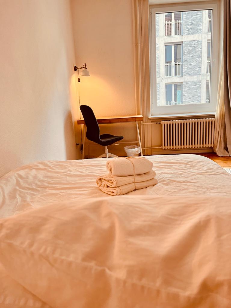 Udobna soba u Airbnb stanu sa 3 sobe, sa velikim prozorom i šarmantnim radnim stolom. Lokacija stana je veoma centralna. Udaljena 1 minut hoda od čuvene ulice Langstrasse (ulica za zabavu), supermarketa(Migro, Kup i Denner), brojnih restorana i barova i 100 m od prelepog parka(Bäckeranlage). Mjesto je udaljeno 3-4 tramvajske stanice(ili 15 minuta hoda) od glavne stanice i ulice Bahnhofstrasse(šoping ulica).