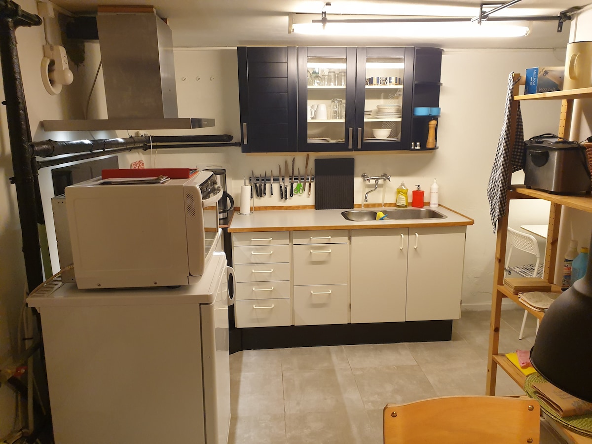 Super udoban mini apartman (24m2 + zajednički prostor) u mirnoj ulici u Arhusu C. U blizini Univerziteta, Poslovne škole, Starog grada i Botaničke bašte. Ovde je sve što vam treba za kratak ili duži boravak. Savršeno za studente ili poslovne putnike. Stan se nalazi u visokom podrumu (bez direktne sunčeve svetlosti) sa zajedničkim kupatilom. Prelepa terasa za sunčanje. Većina sadržaja je na pešačkoj udaljenosti. Lako dostupno javnim prevozom. 2 sata besplatnog parkiranja - nakon toga plaćanje parkinga.