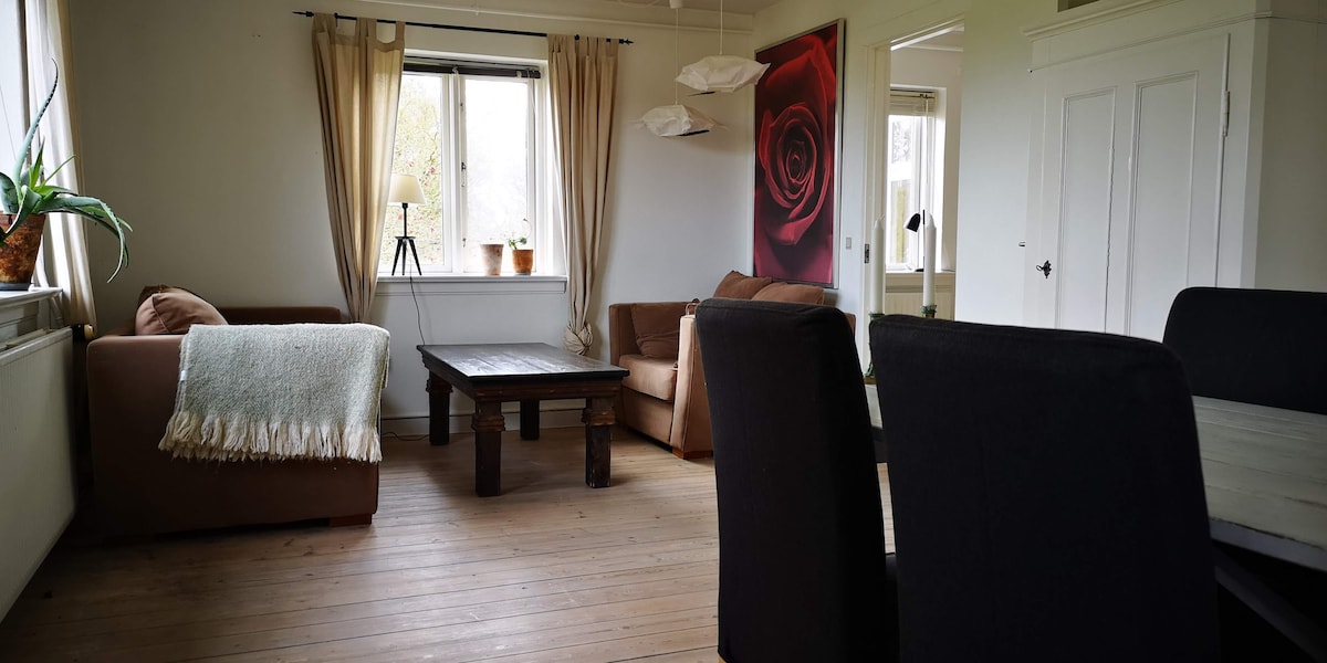 Stan se nalazi na istočnom kraju prelijepe seoske kuće iz 1874. godine sa velikom baštom i spoljnim prostorima. Postoji privatni ulaz i terasa okrenuta prema jugu, kao i kupatilo i kuhinja sa frižiderom - sve sa pogledom na baštu. Parking je dostupan u dvorištu oko velike stare lipe. Stan se nalazi u centru grada i prema prirodi - sa samo 3 km do ribolova i šetnje do Løgten Stranda, i oko 20 minuta vožnje do Arhusa i Mols Bjergea.