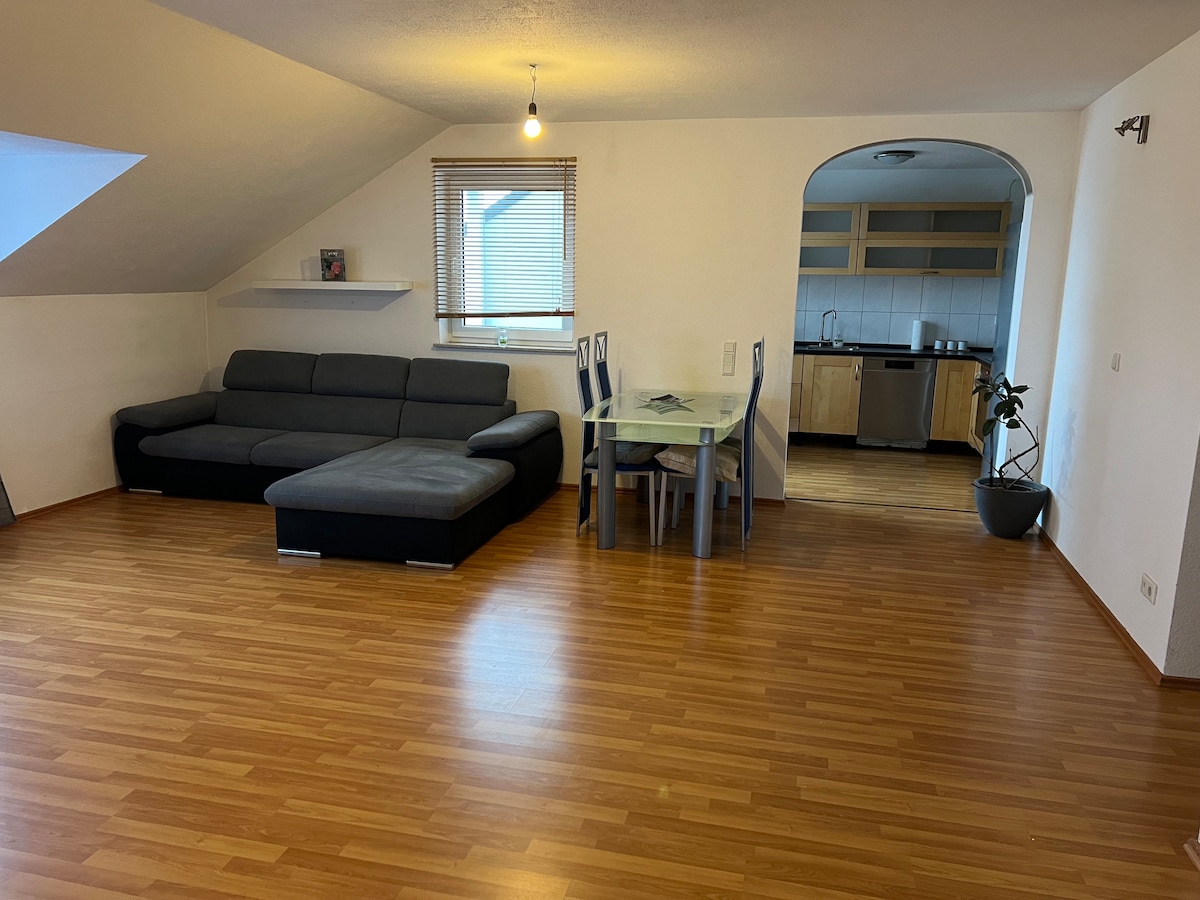Liebe Gäste, wir vermieten unsere ca. 70 qm große Messe-/Projekt-/Ferienwohnung (OG&DG, freistehendes Zweifamilienhaus). Zur Autobahn (A 52) sind es 4 min., 15-20 min. bis Düsseldorf, zur Messe sowie nach Mönchengladbach. Im OG ist die vollausgestatte Küche, ein Duschbad, Diele sowie der helle, große Wohnraum (32qm) und angrenzender Loggia. Im DG befindet sich das Schlafzimmer mit Ausblick auf die Felder (Sonnenuntergang). Die Loggia (Südlage) mit Blick in den Garten lädt zum Verweilen ein.