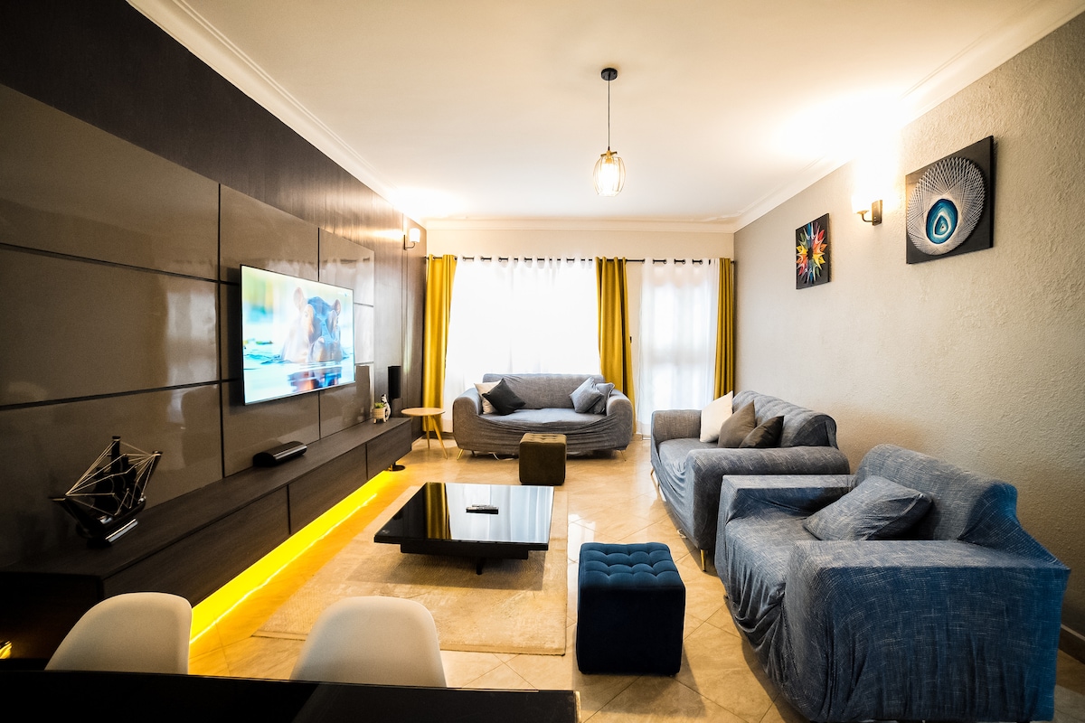 Uživajte u pogledu koji oduzima dah iz ovog modernog stana sa 2 spavaće sobe/2 kupatila u Bukoto Livingu. Stan ima prostran balkon, kompletnu kuhinju, mašinu za pranje/sušenje veša, klima-uređaj, Wi-Fi, pametni TV i pristup zajedničkom bazenu. Zgrada je osigurana čuvarima koji rade non-stop i ima jedno parking mjesto. Usluga čišćenja je dostupna za duže boravke. Mirna, luksuzna baza sa pogledom na Bukoto, Naguru i Ntindu sa pogledom sve do jezera Viktorija.