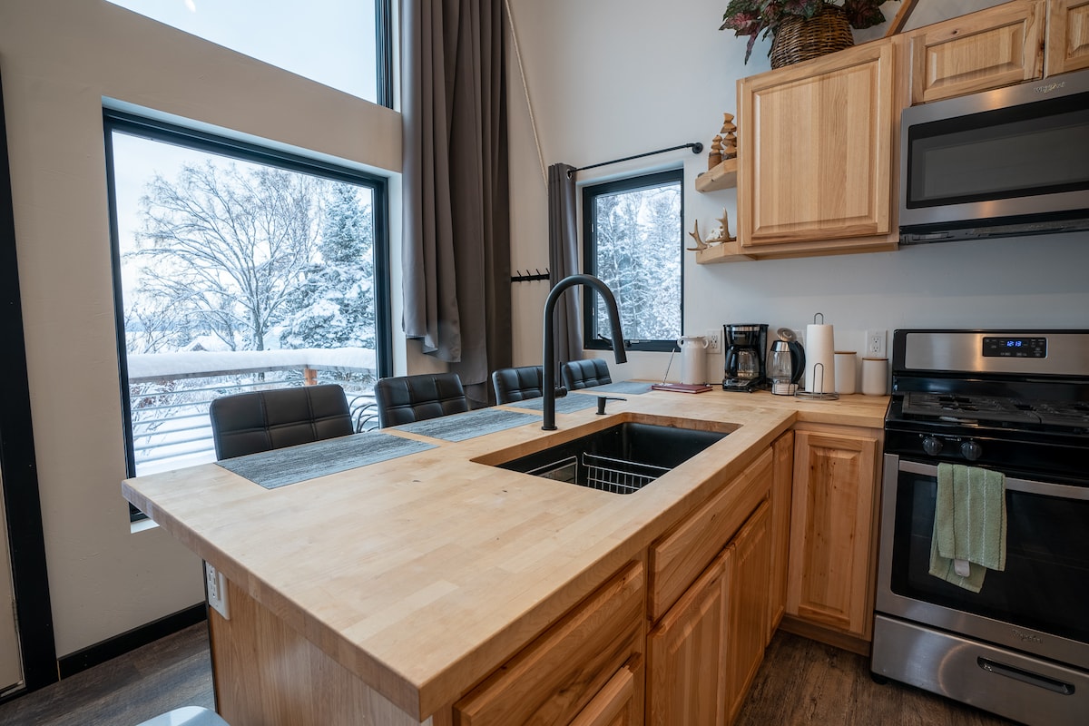 Dođite i uživajte u našem modernom i jedinstvenom odmoru! 3 minuta od centra Homera i 10 minuta od Homer Spit. U blizini grada u mirnom susjedstvu s pogledom na zaliv Kačemak. -1 Bračni krevet (širine 180-220 cm -1 kupatilo sa glavom za kišnicu -Otvoreni koncept dnevnog boravka - Moderni kamin na prirodni gas -Smart TV - Puna kuhinja - Brzi Wi-Fi (50 mbps) - Besplatan parking - Pristup šifri ključa - Nordijski spa sa hidromasažnom kadom, saunom i hladnim uranjanjem