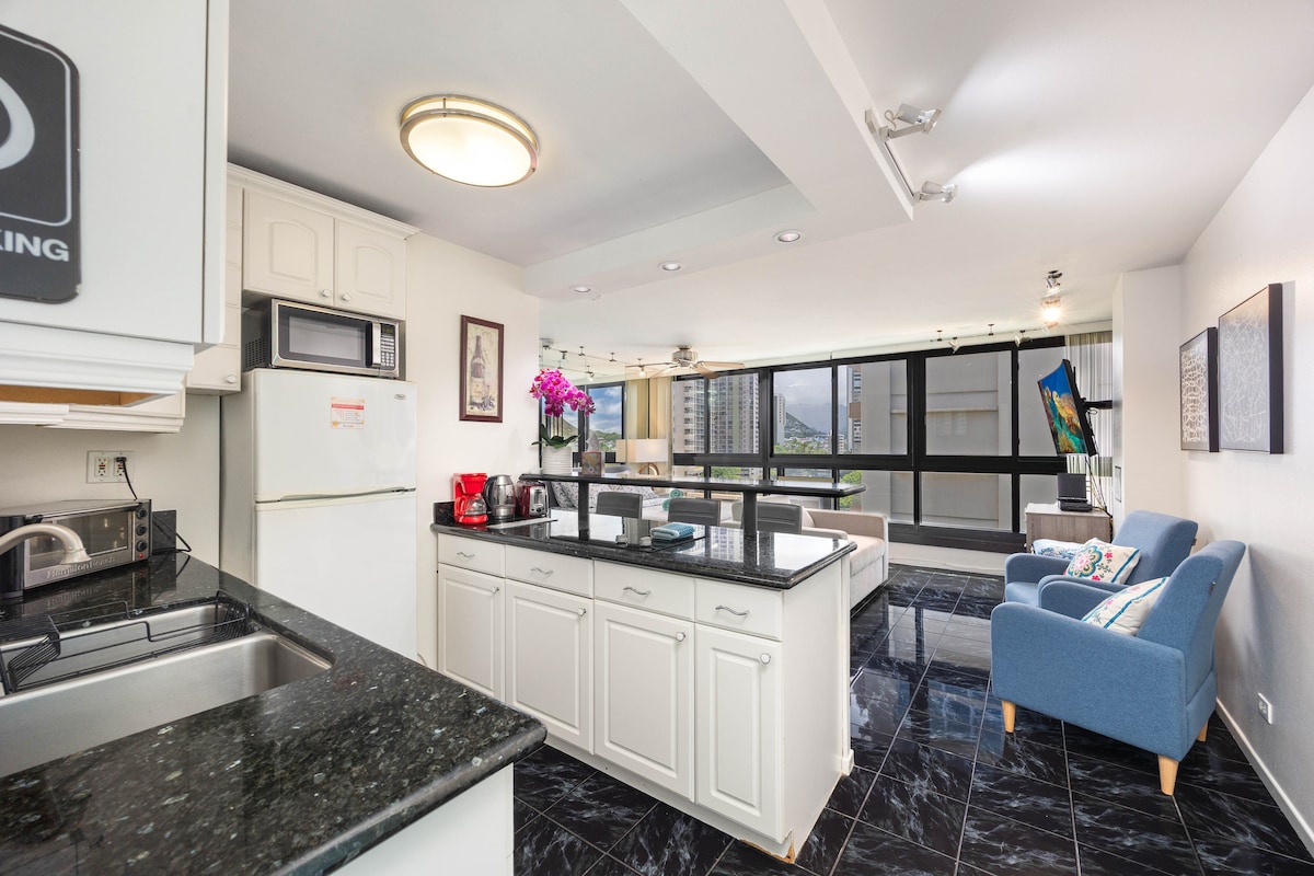 Uživajte u Aloha proleću uz: • Besplatna rana prijava i kasna odjava* • Uključeno je besplatno parkiranje (pogodnost od 50–75 USD dnevno) * Pitajte za detalje. The Honu Suite is a spokojno, dizajnersko utočište u srcu Vaikikija - samo jedan blok od plaže. Uživajte u panoramskom pogledu na Dijamantsku glavu i okean sa 33. sprata, odabranim sadržajima i detaljima sa pet zvjezdica. Ukorijenjen u havajskom nasljeđu, savršen je za zahtjevne parove koji traže udobnost, stil i osjećaj bijega.