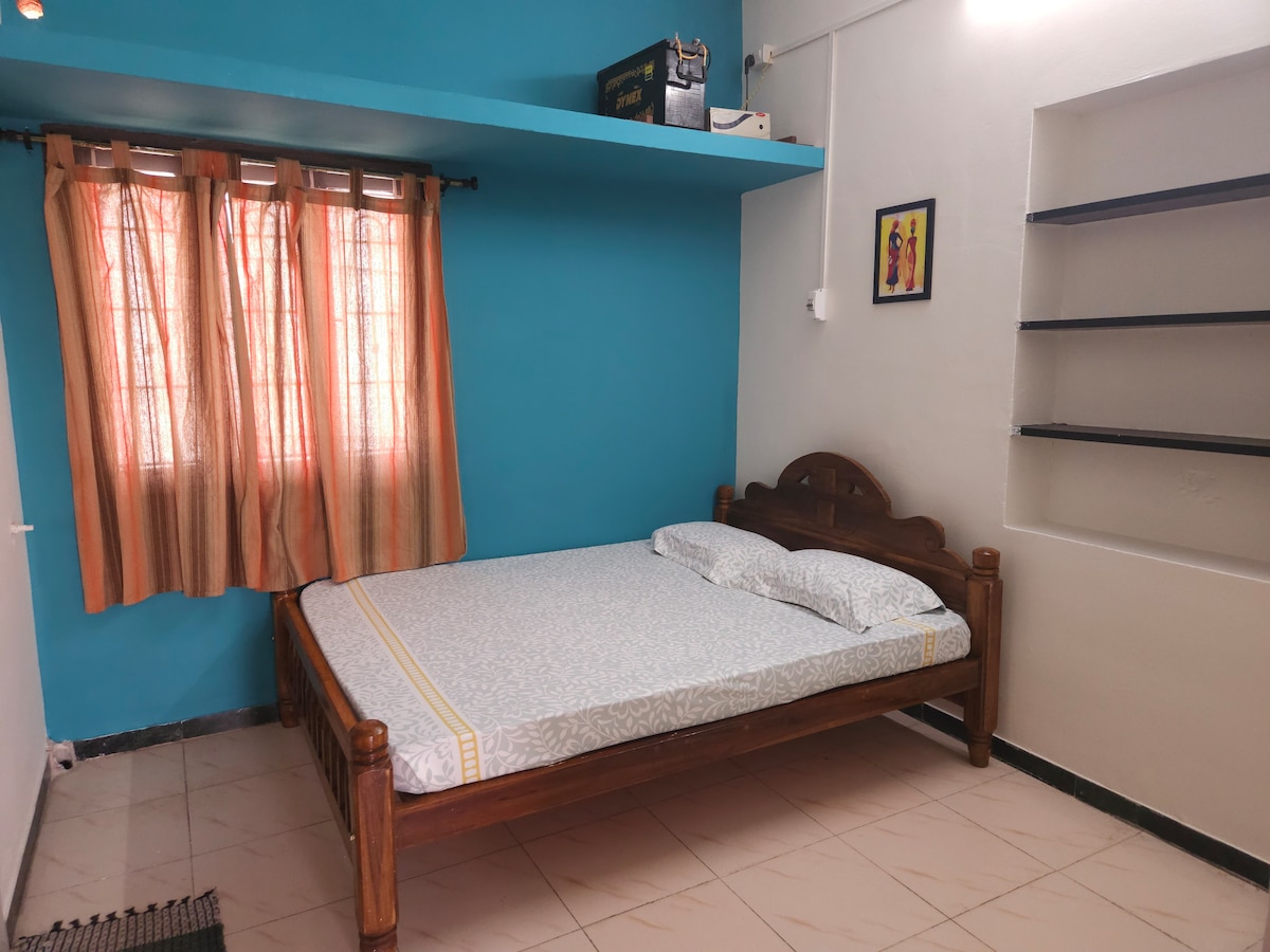 Dobro došli u svoj drugi dom u predgrađu Koimbatorea :). Svaki dio ovog smještaja s ljubavlju je stvoren za našu porodicu. Kuća ima vrata i prozore ekrana. Ima veliki, dobro provjetren dnevni boravak sa svijetl ružičastim zidovima i dvije prozračne spavaće sobe sa kupatilima. Kuća je lijepo namještena i ima radnu stanicu u drugoj spavaćoj sobi. Na zahtjev možemo da obezbijedimo dodatni dušek za goste, dodatni pribor za jelo i druge sadržaje. Potpuno funkcionalna kuhinja i mašina za pranje veša.