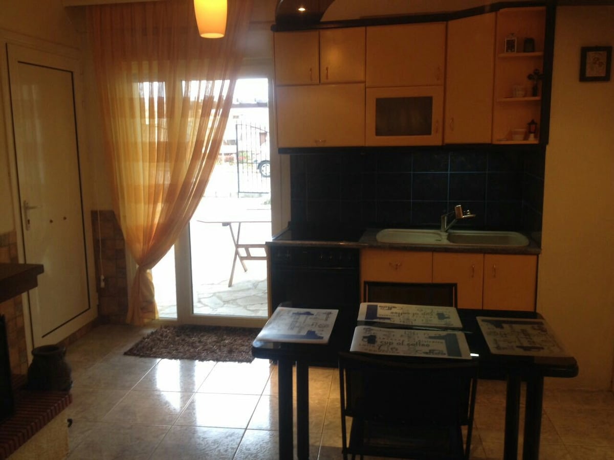 30 metara od plaže (90 stopa) , na imanju Pliades u Siviriju. Udobna i svijetla kuća sa pAMETNI TV i Wi-Fi velika frižider mašina za pranje veša mikrotalasna peć i rerna klima-uređaj je uključen! Pogodno za najviše 4 osobe, porodice itd. Na prvom spratu kompleksa. Sve do mora sa dobrim povetarcem noću! 25 km od plaže Sani i samo 10 km od Kaliteje i 15 km od Afitosa.