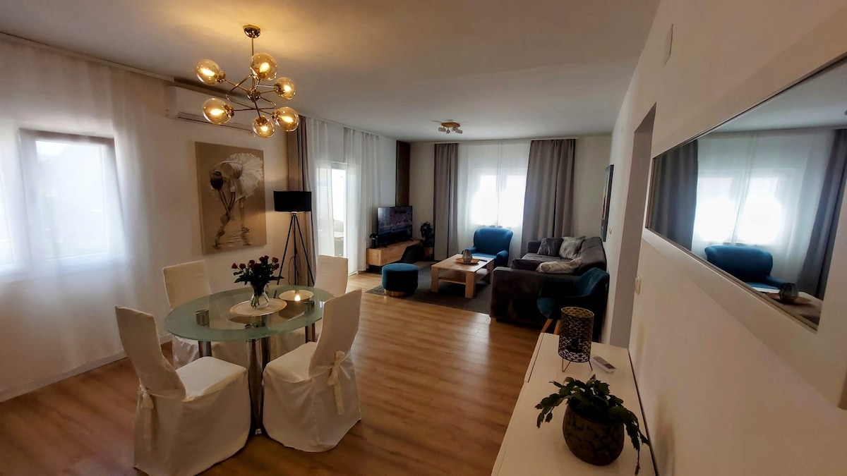 Stan za sporo stanovanje je novi stan veličine 50 m2 sa 4 zvjezdice. Ima mediteransku atmosferu i dizajn. Možete se opustiti na našoj prelijepoj terasi sa zadivljujućim pogledom na more. Stan se nalazi na savršenoj lokaciji, 50 metara od najljepše gradske plaže Znjan. Za 3 minuta ste na plaži. Uberom je potrebno 10 minuta do starog grada. U blizini možete iznajmiti i bicikl.