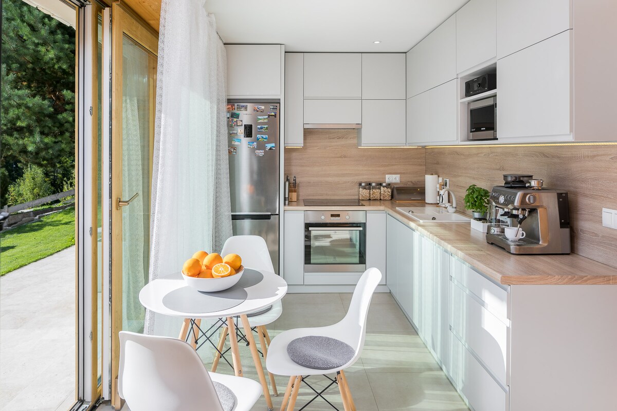 HONAY HOUSE is a cozy and modern cottage with a stunning and unique view of the High Tatra Mountains. Our house is perfectly crafted for everyone who is searching for wild nature, active recreation or just a refuge from the crowded resorts of Podhale. It`s a peaceful location. As a designers we took care of every detail to let you experience a high-quality interior that is extremely natural and warm. Outside the house you can also enjoy wooden chill deck. Welcome to stay on our hill.