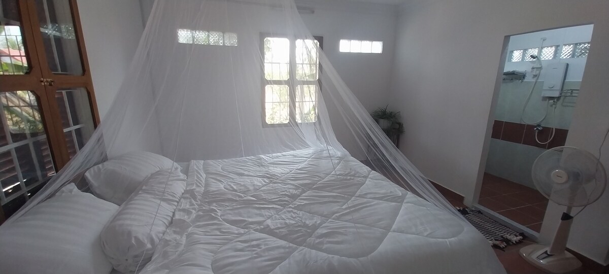 A relaxing, peaceful private apartment freshly renovated for 2025. located in quiet village /suburb of kampot town and a few minutes away from riverfront /town centre by tuk tuk or scooter. ground floor surrounded by banana trees and nicely shaded from the sun the apartment has cooling terracotta floor tiles throughout, bamboo and teak furniture, a/c bedroom with comfy king size bed and en suite bathroom/hot shower. mosquito nets , fridge, freezer, gas hob. perfect for couples /solo travellers