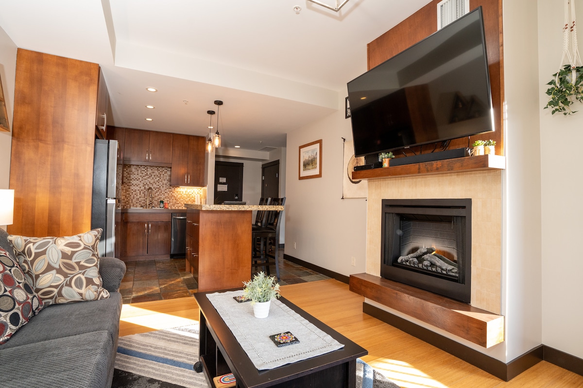 NEW Fireplace 🔥 You will love this stylish suite in Blackstone Mountain Lodge, one of Canmore's premiere resorts. Imagine enjoying a home-cooked meal overlooking the stunning view of the Canadian Rockies from your own suite and the balcony, relaxing after a great day of outdoor adventures. Unwind in hot tubs and relax in the year- round heated outdoor swimming pool. Within walking distance to all that Canmore has to offer. 15 mins drive to Banff