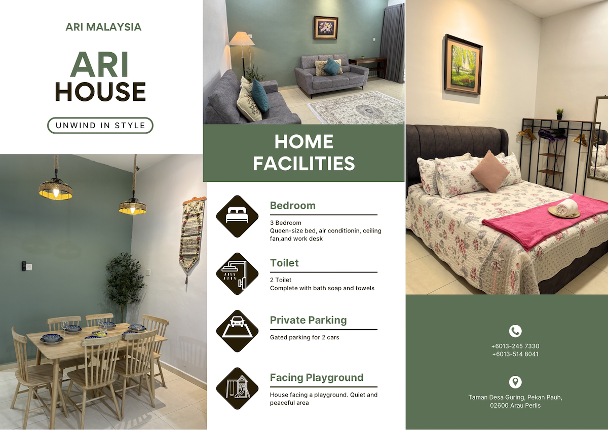 Udoban boravak u mirnom i tihom okruženju. Strateška lokacija u blizini mnogih atrakcija, 20 km do Padang Besara, Vang Kelian, Gua Kelam; 12 km do Araua i Kangara, 15 km do Kuala Perlisa. MRSM Beseri i IKM su udaljeni samo 6 km, UNIMAP Pauh 20 km. Kuća je opremljena osnovnim priborom za kuvanje, frižiderom, mikrotalasnom pećnicom i kafom. Peškiri za kupanje i pegle su obezbijeđeni. Dvorište kuće je malo veliko za 4 parking mjesta. 5G WiFi i Android TV su takođe obezbijeđeni za vas da uživate u Netflixu, YouTube-u itd.