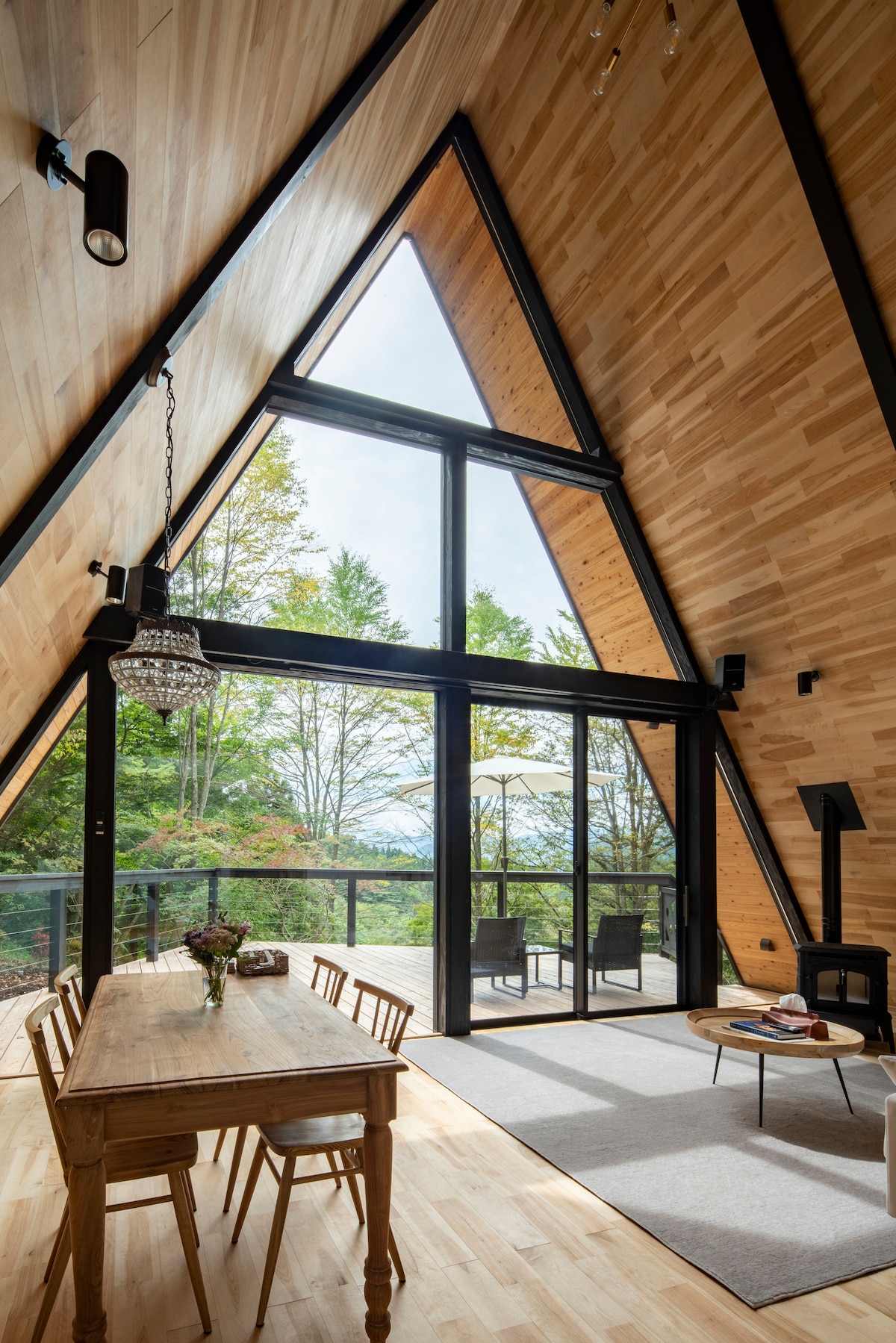„KUĆA U obliku slova A” je novoizgrađena i vrlo jedinstvena kuća u obliku trougla koja se nalazi u prelijepom kvartu Minami Karuizava. Promatrajte okolna drveća i planine kroz osam metara visok južno, okrenut prema trouglastom prozoru. Izađite na drvenu terasu od 20 kvadratnih metara i u potpunosti uronite u prirodu. Moderna unutrašnjost zapadnog stila učiniće da se osećate kao da ste u Evropi ili Severnoj Americi. Dođite i opustite se u jedinstvenom domu i uživajte u mirnoj lepoti Minami Karuizava.