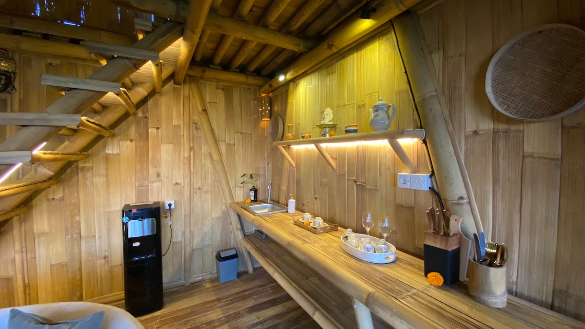 Vila Sandag Jungle Bamboo – vaše utočište u srcu Sidemena, Karangasem. Smješten visoko u bujnom gorju Balija, naš jedinstveni bambusov smještaj nudi neuporediv mir i prirodne ljepote koje oduzimaju dah. Vaše privatno utočište: Ova ekskluzivna vila sa jednom spavaćom sobom u potpunosti je ručno izrađena od održivog bambusa, koji se skladno uklapa u okruženje. Probudite se uz panoramski pogled na veličanstvenu planinu Agung i legendarne pirinčane terase Sidemena.