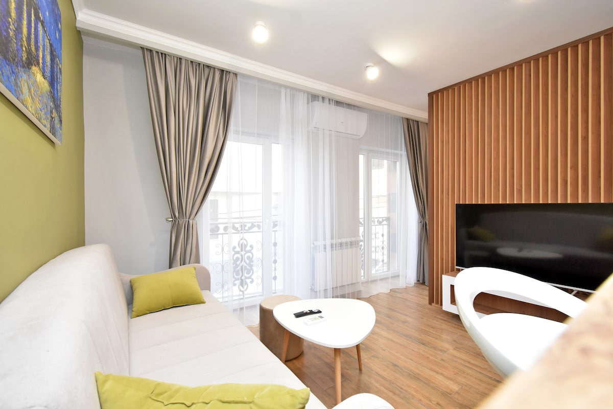 Prostrani, svetao stan u centru Jerevana!Odlična lokacija i pogodno dostupna za sve što vam je potrebno, od restorana, kafića,turističkih mesta. Stan je u potpunosti opremljen sa svime što vam je potrebno za putovanje. Dnevni boravak u trpezariji sa kaučem na razvlačenje,kuhinja sa mikrotalasnom i aparatom za kafu, spavaće sobe sa bračnim krevetom i kupatilom. Vaše zdravlje je naš prioritet. Naš dom prati poboljšani protokol čišćenja,sa profesionalnim čišćenjem i srtagičnom dezinfekcijom.