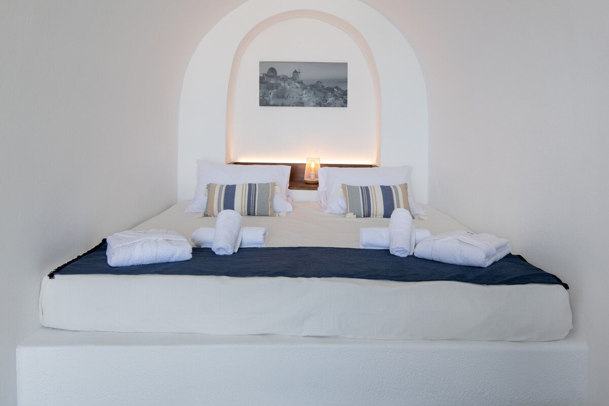VRHUNSKI POGLED na MORE i ZALAZAK SUNCA CALDERA nalazi se na VRHU kaldere u Imerovigliju s pogledom na okean (Egejsko more), Kalderu, vulkan, druga obližnja Kikladska ostrva i čuveni zalazak sunca. Ima privatni i prostrani vanjski đakuzi/mini bazen/ hidromasažnu kadu za dvije osobe koja se nalazi na zajedničkoj terasi. Sastoji se od privatne dvokrevetne spavaće sobe, malog dnevnog boravka, privatnog kupatila i zajedničke terase. Ovaj smještaj ne može da primi djecu mlađu od 4 godine.