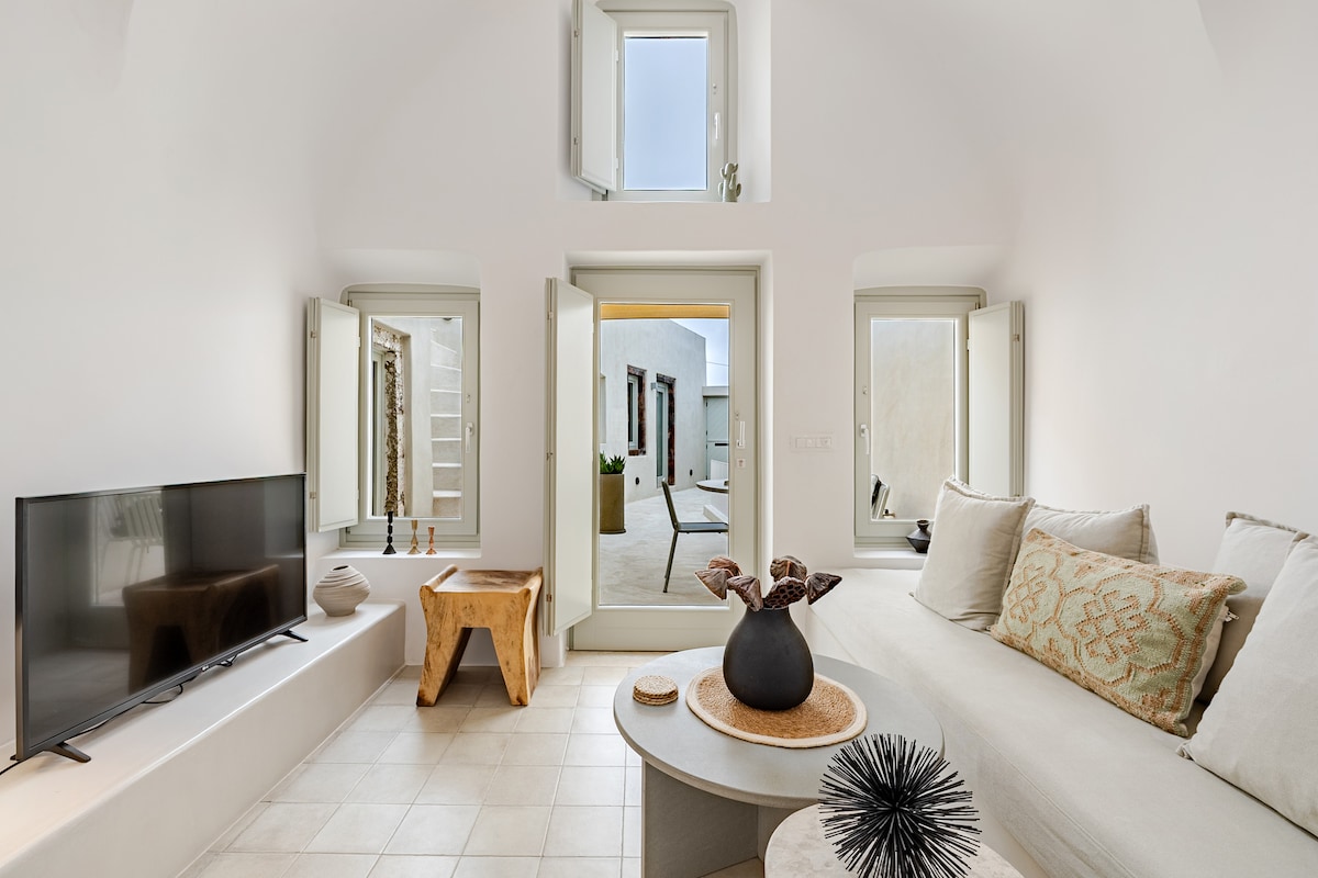 Dobro došli u apartman Čther, gdje se duša Santorinija susreće s poezijom egejskog neba. Ušuškan u bijelim liticama Oje, naš sanjivi apartman vas poziva da uđete u svijet mira, ljepote i svjetla. Svaki ugao je okupan kikladskom elegancijom, zakrivljenim linijama, mekim teksturama i osećajem spokoja koji djeluje bezvremenski. Savršeno mjesto za parove i medeni mjesec!