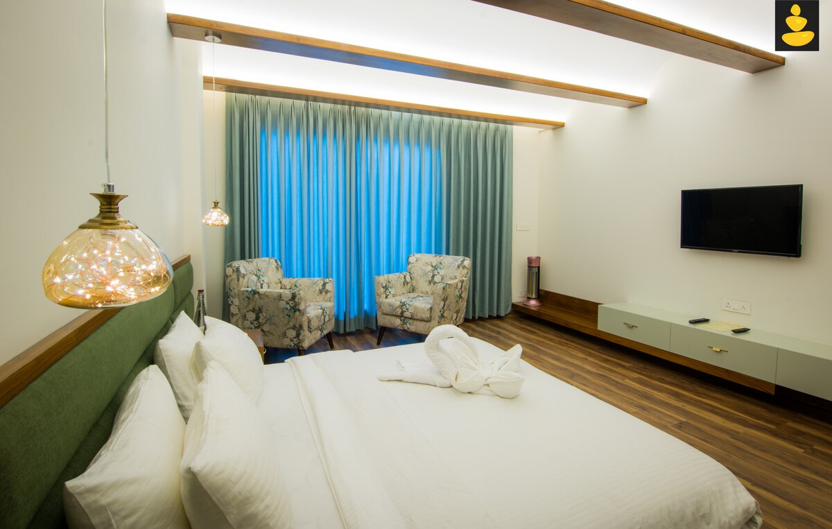Surrounded by pine-covered slopes, this villa is designed for those who find joy in quiet luxury and thoughtful details! Beneath a sloped ceiling with exposed wooden beams, the indoor bar area is ideal for leisurely evenings with its dark wood counter, cushioned black stools, vibrant sofa and AC for added comfort. The spacious terrace offers breathtaking 360° hill views, bordered by colorful flowers, while the lounge den features an L-shaped sofa and a uniquely shaped wooden coffee table.