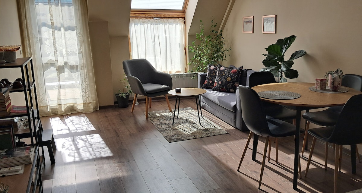 Welcome to my boutique attic studio at the foot of Vitosha. Bright, minimalist and peaceful space with beautiful mountain and city views. Located in a quiet, safe area—perfect for evening walks and relaxing away from the center. The bed features a Magniflex mattress and pillows for excellent rest. The studio has a fully equipped kitchen, fast Wi-Fi and a cozy work/dining area. Clean, calm and with easy access to both the mountain and the city.