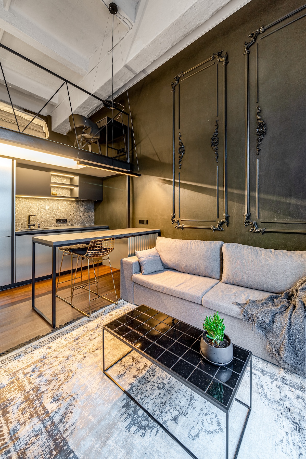 Pozivamo vas u moderan gradski potkrovlje s visokim plafonima i galerijskom atmosferom. Unutrašnjost je oblikovana čistim linijama, metalnim detaljima i umetničkim akcentima, stvarajući suptilan osećaj njujorških kreativnih okruga. Električni kamin u dnevnoj sobi omogućava vam da promijenite ton i raspoloženje osvjetljenja: od ugodne večernje smirenosti do sjaja gradske noći. Prostor za spavanje u mezaninu pruža privatnost, a detalji dizajna kupatila suptilno podsjećaju na estetiku gradskih panorama.