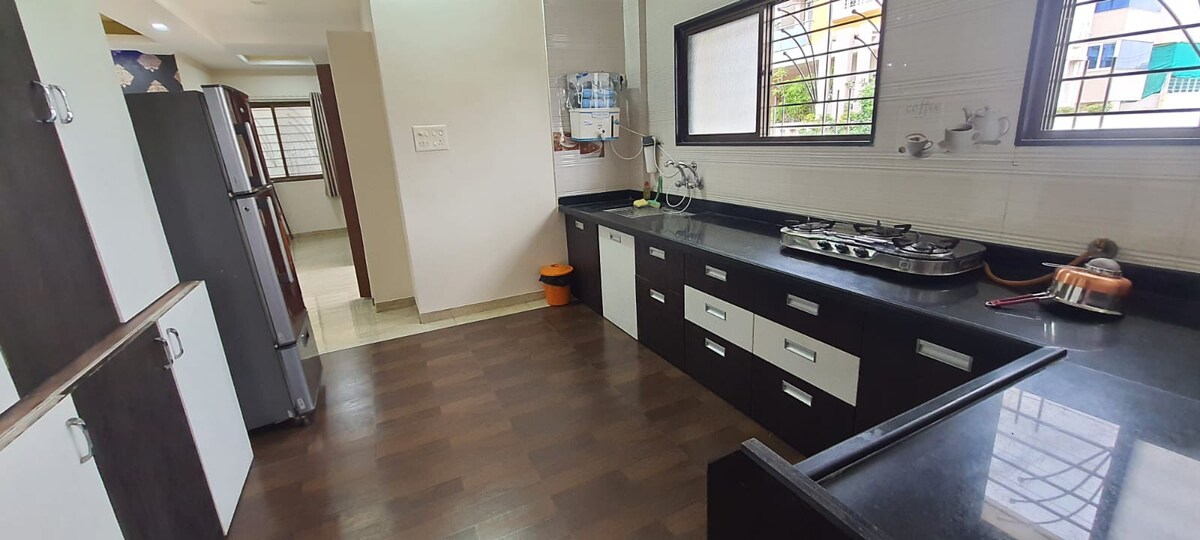 Moderno uređen stan na najvišem spratu sa 1 spavaćom sobom u Balajinagaru, Sangli, u blizini Kupvada i Miraja MIDC. Svetla dnevna soba sa velikim staklenim prozorom i otvorenim pogledom, 55-inčnim pametnim TV-om, brzim Wi-Fi mrežom i kaučem na razvlačenje. Potpuno opremljena modularna kuhinja, mašina za pranje veša, spavaća soba sa radnim stolom, topla voda i parking. Idealno za poslovna putovanja, parove i male porodice. Dostupna je samostalna prijava.