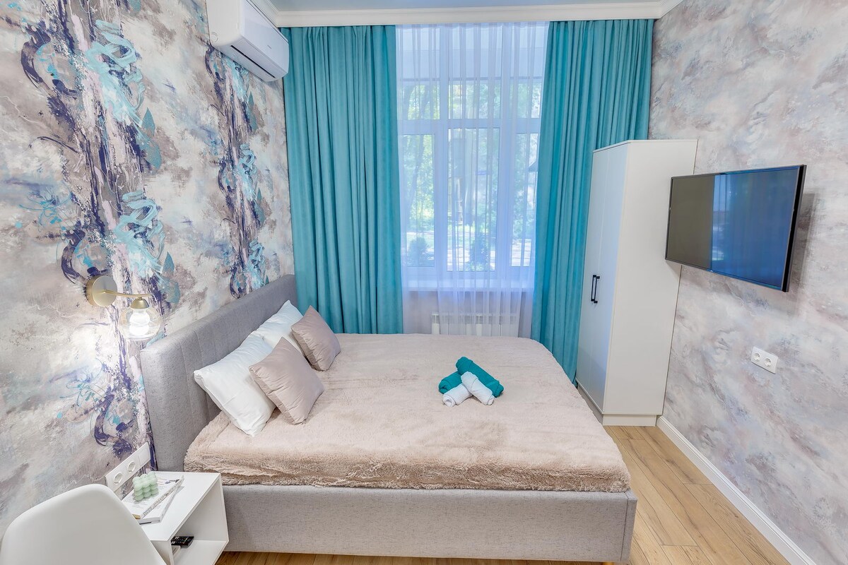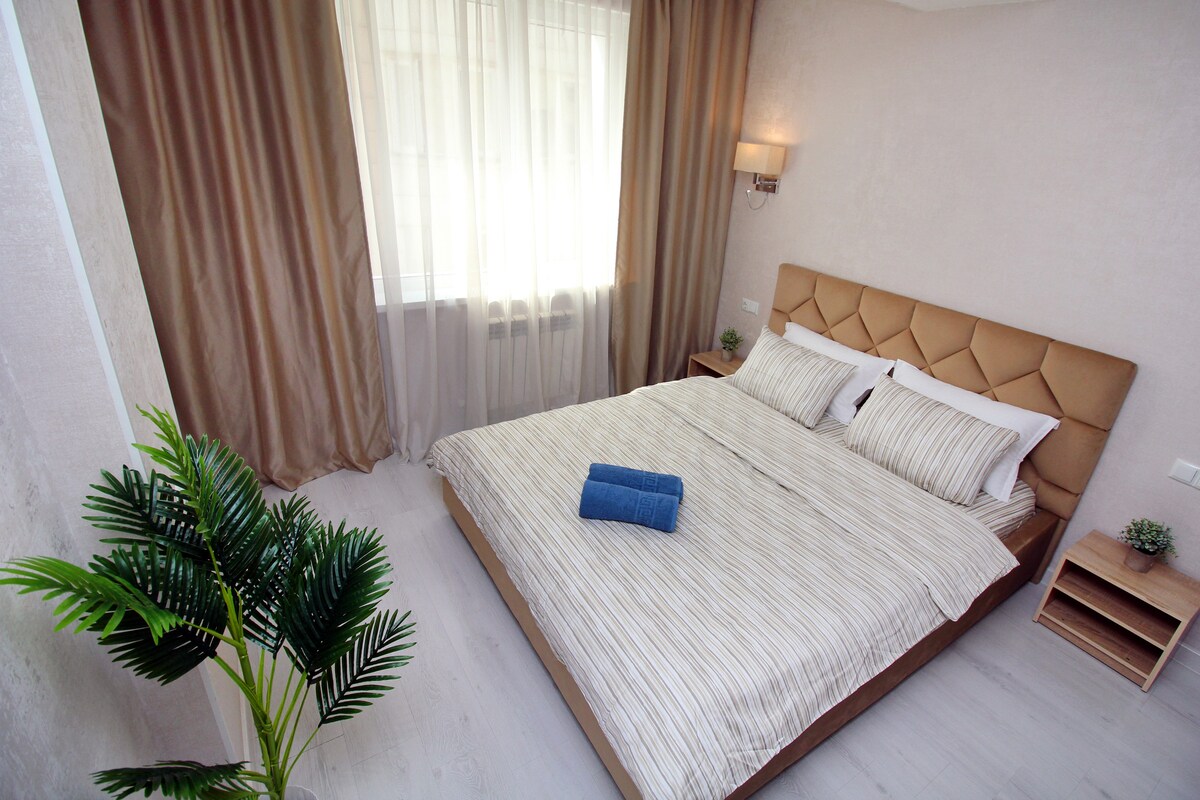 Novi nameštaj, vodovod, moderan dizajn. Studio ima sve što vam treba za udoban boravak: - bračni krevet sa ortopedskim dušekom - Sveža posteljina i peškir - daska za peglanje, pegla, fen za kosu, mašina za pranje veša - vrlo brz i stabilan, neograničen Wi-Fi - kupatilo sa novim vodovodnim instalacijama - Smart TV - čajna kuhinja sa svim neophodnim aparatima i posuđem - klima-uređaj 5-10 minuta hoda do tržnog centra MEGA, parka First President Park, rijeke Boljšaja Almati.