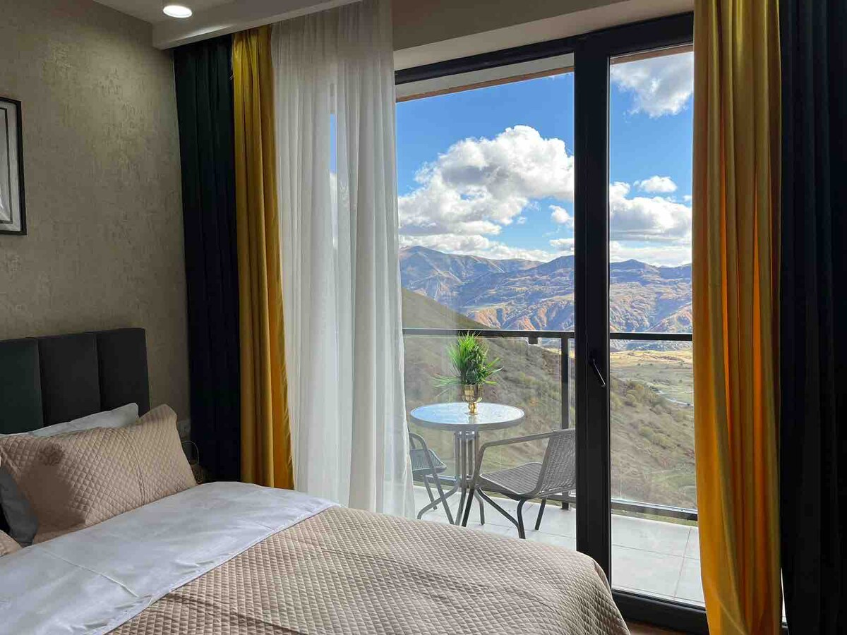 Predivan apartman u atmosferi planinske kuće sa panoramskim pogledom na planine nalazi se u srcu skijališta Nju Gudauri 2300 m iznad mora, u rezidenciji BLIZANCIMA. Minimalistički dizajn, prirodne teksture i epski pogled. Uživajte u fantastičnom pogledu na dolinu Gudauri i skijašku stazu, kao i u zalascima sunca koji oduzimaju dah dok se okupate. Planinski potoci, neprestano promenljivo nebo, stada stoke sa pastirima i nezaboravne grmljavinske oluje noću leti. Popularni Kazbegi je udaljen 40 minuta vožnje.