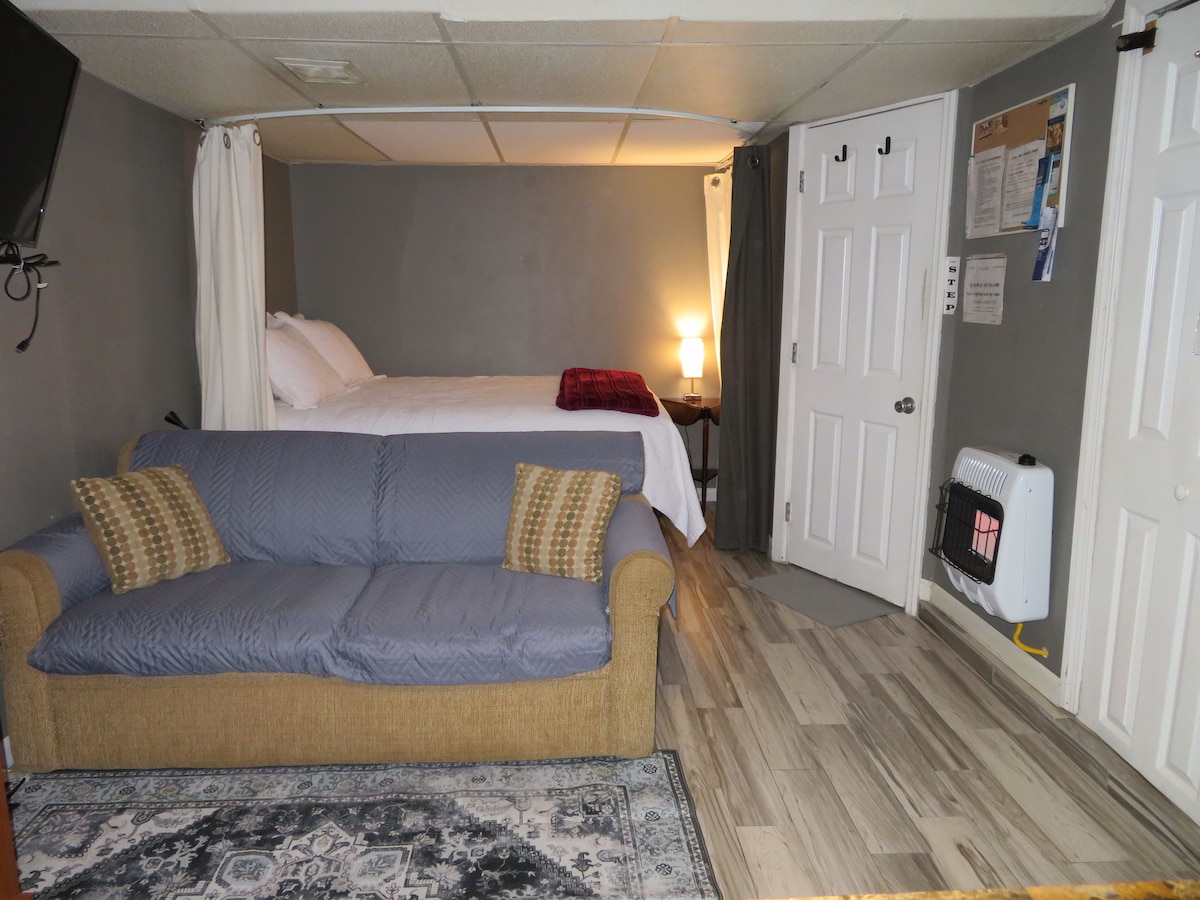 Privatni studio apartman - prizemlje uklj. Zadnje dvorište sa *parkingom. Uključuje bračni krevet, kauč na razvlačenje, privatno kupatilo, čajnu kuhinju, sto i stolice, ormar, mikrotalasnu pećnicu, aparat za kafu, toster, frižider, fen za kosu, Smart TV, Wi-Fi, grijanje, međunarodni aerodrom Njuark, tržni centar Džerzi Garden i 10 minuta vožnje. Njujork 30 minuta. KRATKA ŠETNJA do: željezničke stanice, Univerziteta Kean, I-HOP, Vendi, Tako Bel, DD, Porodični dolar itd. *Parking mjesto: putnički automobil i terensko vozilo. Takođe, parking na ulici.