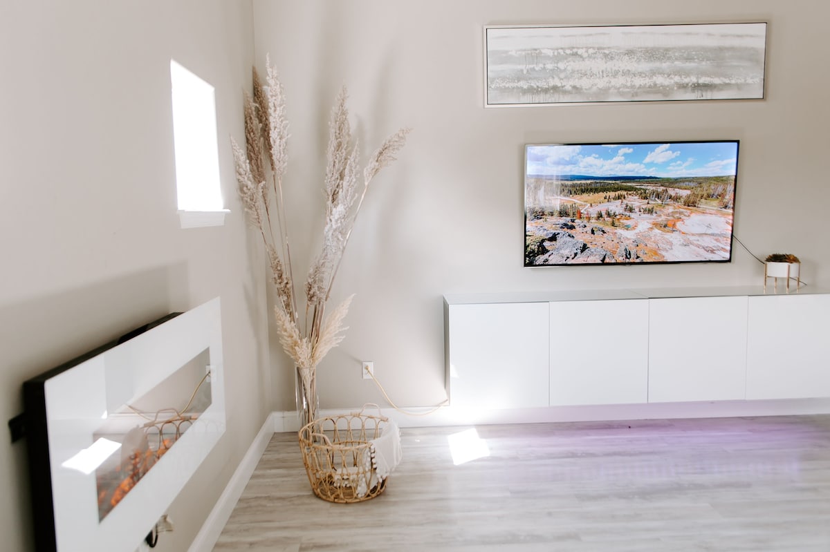 Uživajte u elegantnom doživljaju u ovom smještaju koji se nalazi u centru grada. Ovaj dom nudi glavnu spavaću sobu sa bračnim krevetom, pametni TV, ormare, tuš-kabinu i veliku kadu za umivaonik! Veliki kauč na razvlačenje nalazi se u dnevnoj sobi, sa pametnim televizorom i kuhinjom otvorenog koncepta. Postoji još jedan manji Airbnb koji se nalazi iznad zasebne garaže ako je potrebno više soba kako biste mogli da vidite druge napolju u sklopu objekta.