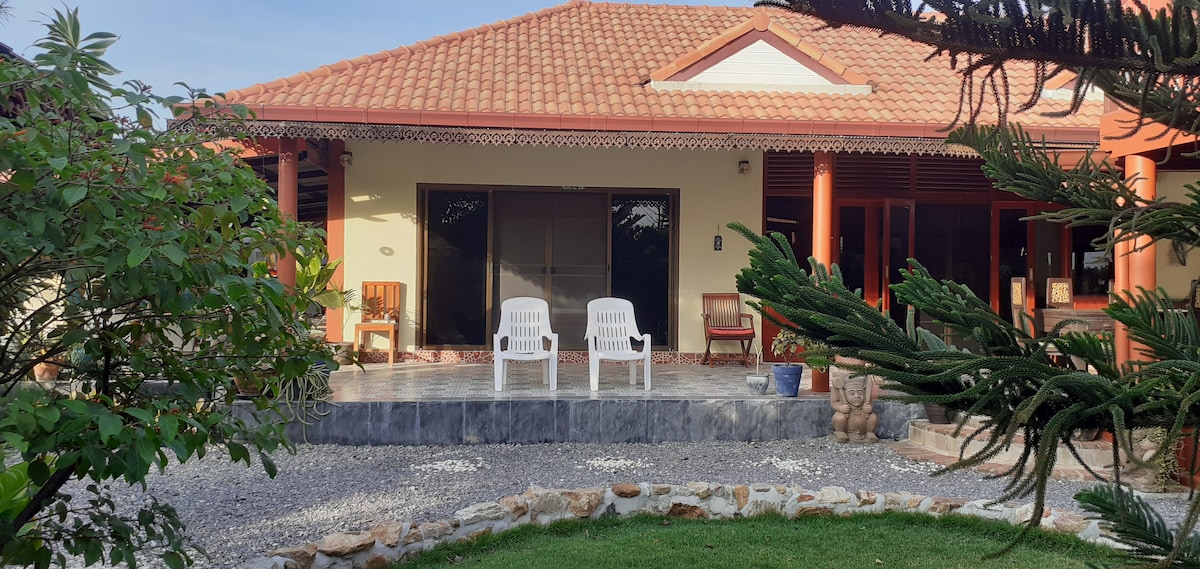 Pobjegnite iz grada i opustite se u ovoj mirnoj vili s bazenom s 3 spavaće sobe samo nekoliko minuta od plaže Pranburi. Areeya Retreat nudi privatni bazen, sto za bilijar, potpuno opremljenu kuhinju i svijetao, prirodno osvijetljen životni prostor — savršen za opuštanje ili rad na daljinu uz brzi Wi-Fi. Okružen poljima i samo 1,3 km od puta uz plažu, idealan je za porodice, grupe ili parove koji traže udobnost i mir. Uživajte u popustima od 15 do 30% za nedeljne i mesečne boravke.