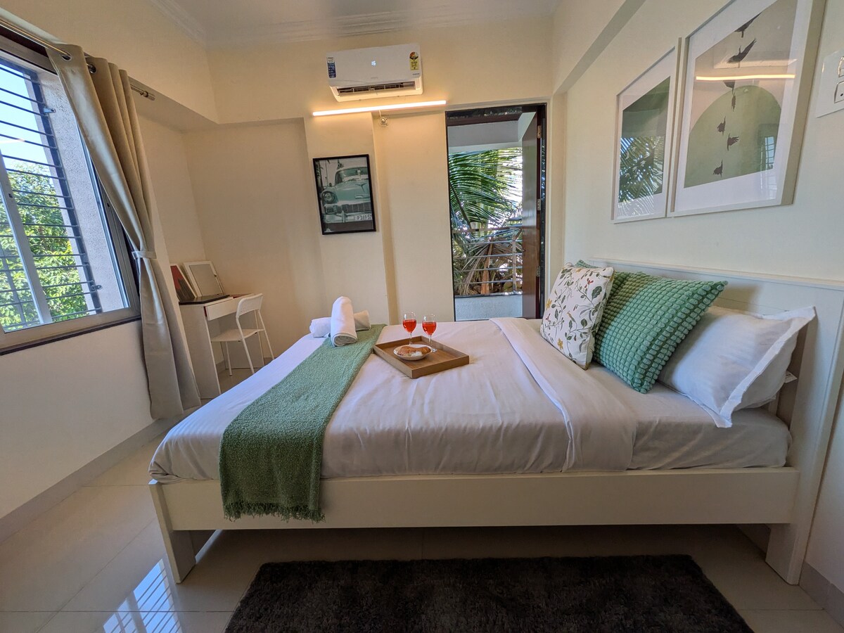Vrhunski jednosobni stan u Puni, dizajniran za udobnost i produktivnost, sa bračnim krevetom (širine 180–220 cm), brzim Wi-Fi mrežom, posebnim prostorom za rad i svakodnevnim čišćenjem. Idealno za parove, poslovne putnike i duže boravke