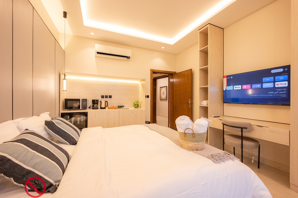 Smješten sa svojom prepoznatljivom lokacijom i u blizini svih vitalnih područja (King Abdulazizou University Dr.Sulaiman Al Habib Hospital, željeznička stanica i dnevne usluge non-stop, ima glavnu spavaću sobu sa privatnim kupatilom i elegantan i udoban salon sa pametnim ekranom sa pristupom internetu, Netflix, VIP i druge aplikacije. U smještaju se nalaze i neke male rekreativne igre. Možete da uživate i u industriji čaja i kafe, kao i u frižideru, stolu za peglanje, stolu za peglanje, karlingu i posebnoj situaciji.