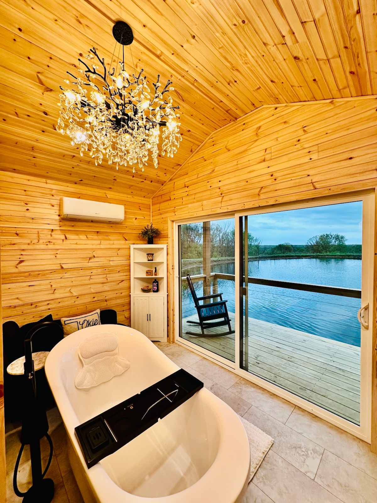 This single room log cabin overlooks our 35-acre lake and includes an outdoor fire pit, small deck with rocking chairs, indoor fireplace, efficiency kitchen with oven and petite fridge, AND A NEW WATER HEATING SYSTEM!!!!! This cabin is 30-yards from our conference and event center. If we have an event, you will likely see and hear guests and staff coming and going.