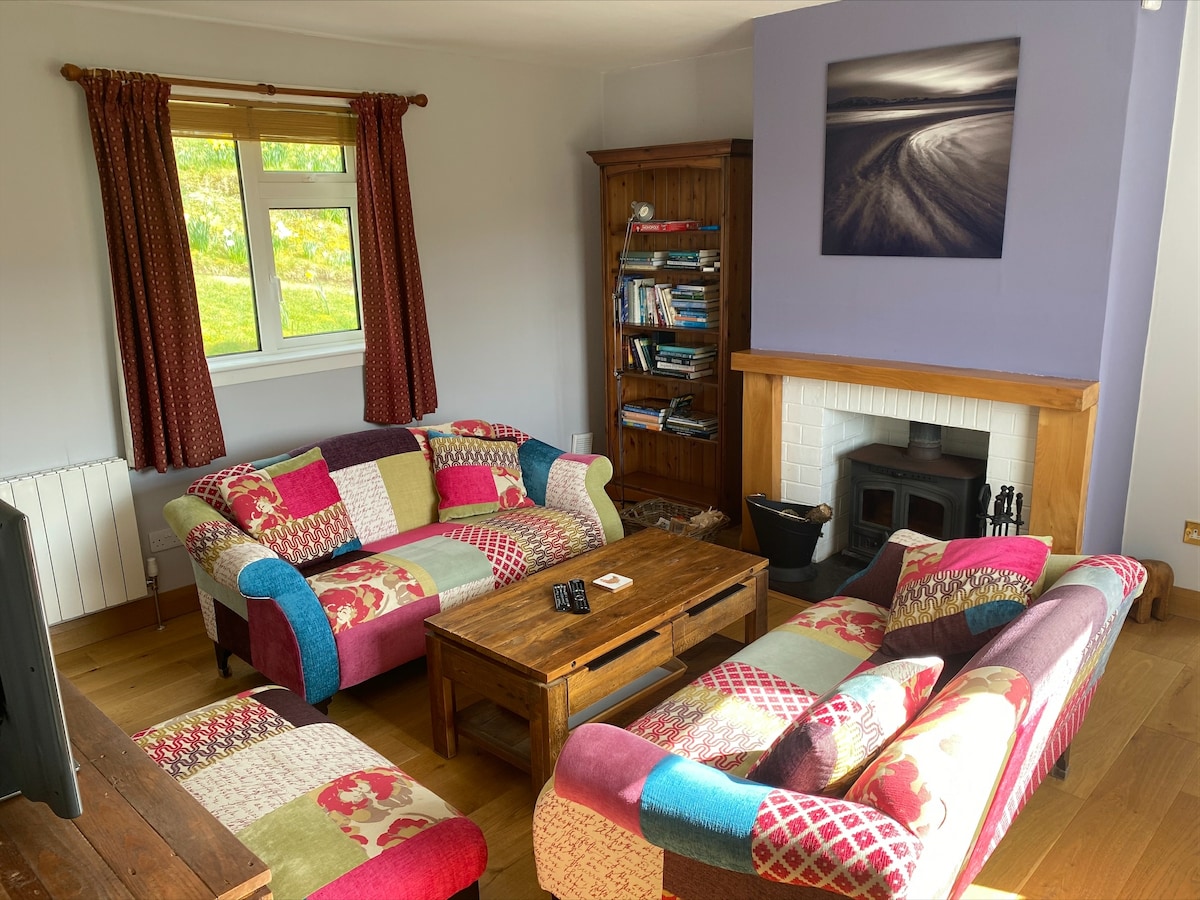 Ostrvska kuća koja kombinuje tradicionalnu kamenu spoljašnjost sa novouređenim enterijerom - drvenim podovima, barom za doručak, šporetom na drva i podnim grijanjem. Predivan pogled na Hebridejska ostrva. 8 km od trajektnog terminala. Imajte na umu da za 6 gostiju možemo da dodamo još 2 kreveta za jednu osobu u dvokrevetnu sobu ili da se kauč u dnevnoj sobi pretvara u bračni krevet.