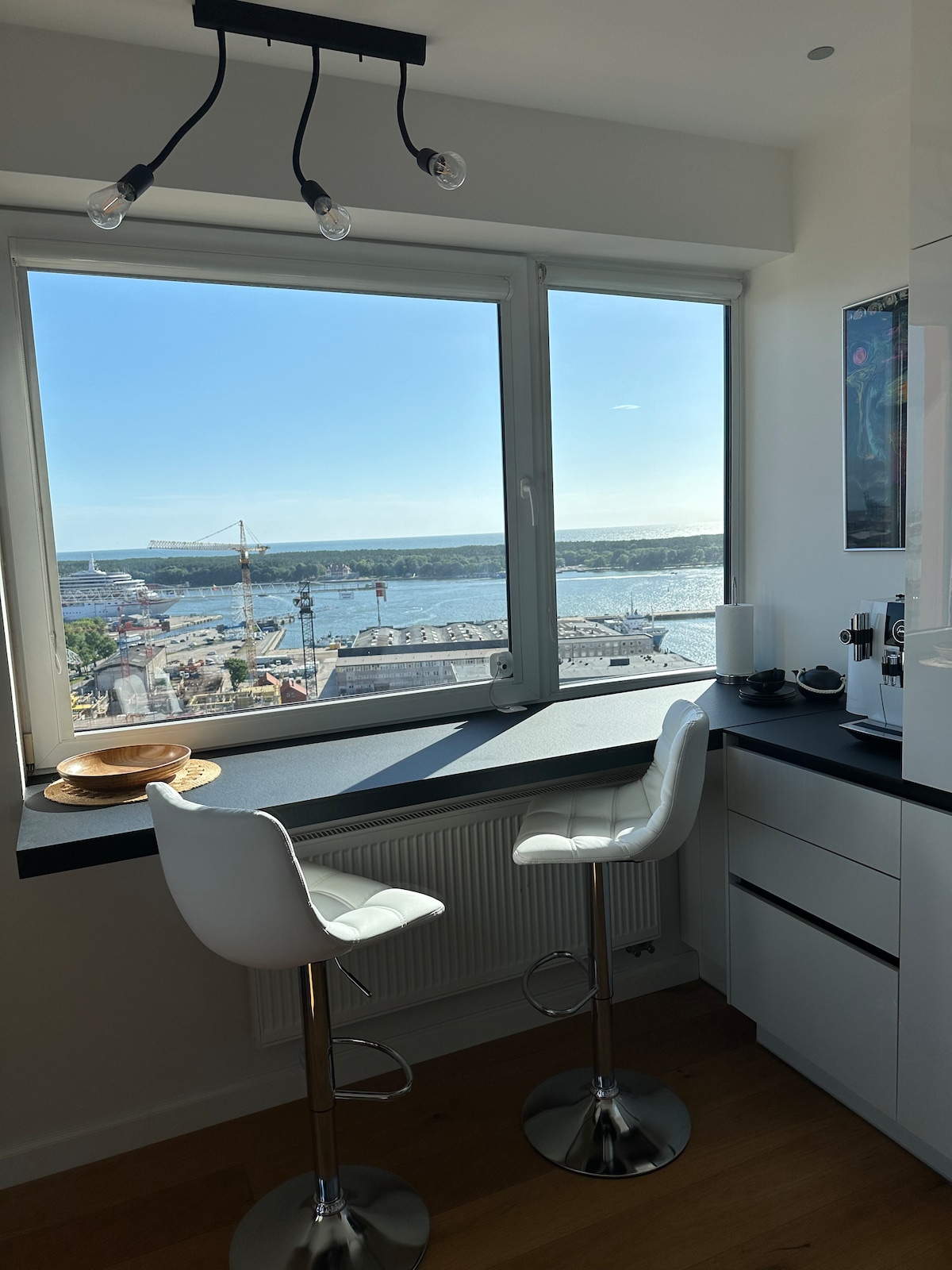 Elegantan apartman na 12. spratu u centru grada s prelijepim pogledom na Kuronski zaliv i more, a nazire se i Stari grad. Uživajte u jutarnjoj kafi na balkonu ili se opustite u udobnom, modernom prostoru. Stan može udobno da primi do 4 gosta. Bićete okruženi restoranima, kafićima i barovima, a lako ćete moći da stignete do trajekta koji vozi do obale mora. ❗ Važno: Prilikom rezervacije unesite tačan broj gostiju, uključujući djecu.