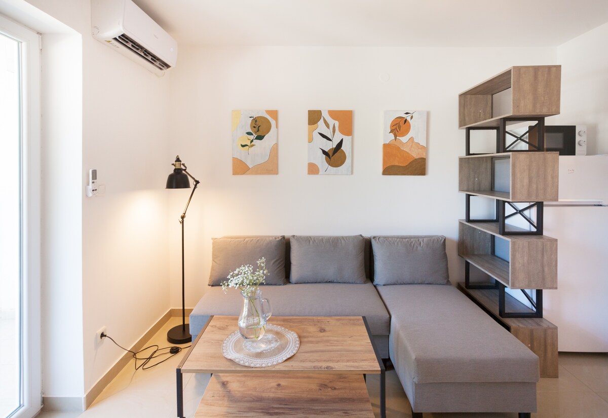 Dobrodošli u apartman Tamaris na samom šetalištu uz more! 🌊 Uživajte u pogledu na zaliv iz dnevne sobe sa staklenim zidom, gde trosed postaje udoban krevet. Moderna kuhinja opremljena je za duži boravak, a luksuzno kupatilo s usponskim tušem pruža pravi spa doživljaj. Renoviran 2022, stan nudi savremeni stil i udobnost. Napomena: U julu i avgustu živahna atmosfera i večernja buka čine ga idealnim za mlađe goste! 🎉