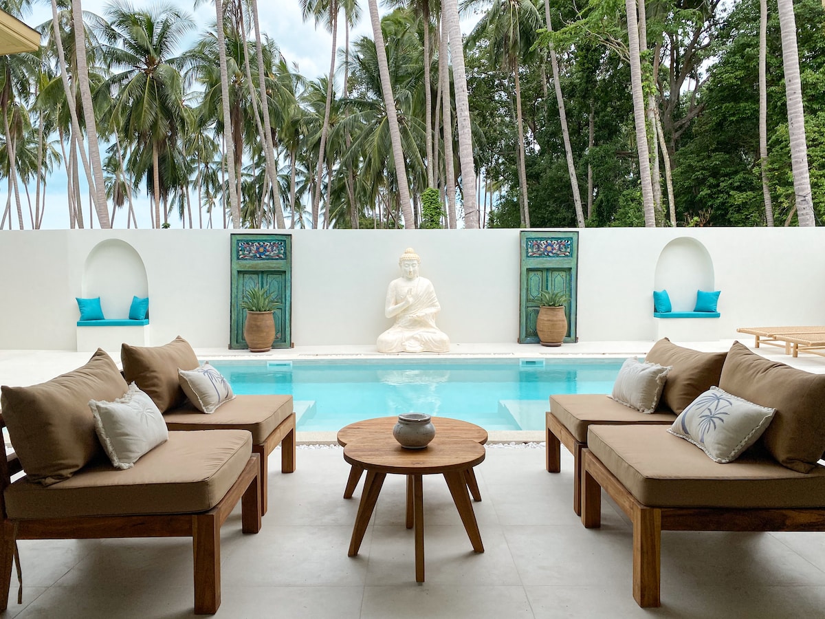In the tropical south of Samui lies villa" Baan Suaan Kluay Mai"( Orchid garden).A modern 3 bedroom hide-away villa close by the sea with its own salt water pool.Just minutes walk from 3 beaches. All utilities included. Breakfast on request. Take a dip ,simply relax by the pool. Enjoy chilled drinks whilst sitting in the shade .A villa where you can truly get-away. Full modern kitchen.Don't like to cook?Thong Krut beach village is only 800 metres away, many cafes and restaurants.