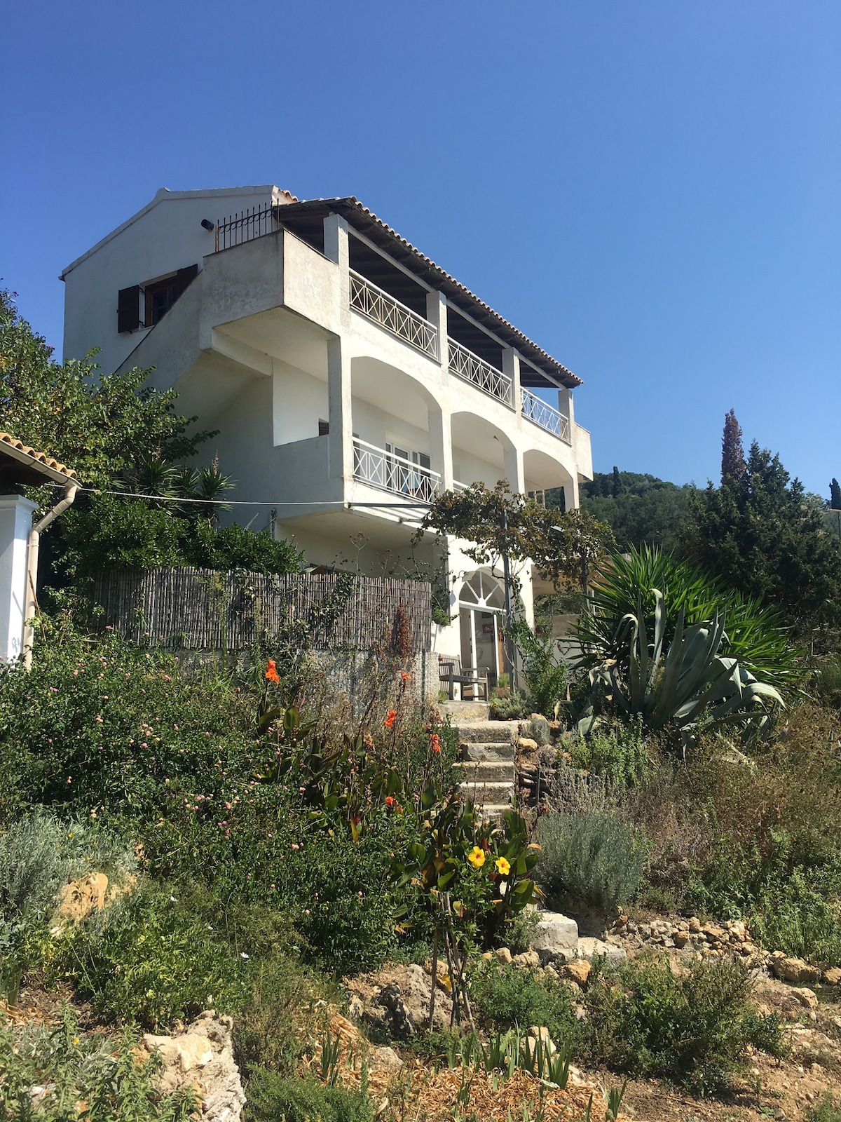 Stan se nalazi na zapadnoj obali prelijepog ostrva Krf, okružen prirodom. Samo 10-15 minuta hoda od stana, pronaći ćete idiličan zaliv sa pješčanom plažom, dva restorana i mini pijacom na kojoj možete da dobijete sve za svakodnevne potrebe. Od aerodroma u gradu Krfu potrebno vam je oko 25 minuta automobilom do stana. Planinarska staza do obližnjeg manastira i uz planinu počinje odmah pored kuće. Savršeno mjesto za bijeg od svega.
